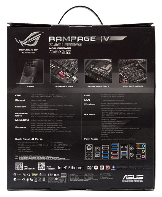 Сразу обращает на себя внимание изображение на лицевой стороне упаковки героя из игры Assassins Creed. Как и рассмотренная ранее Rampage IV Formula/Battlefield 3 новинка позволяет пользователю бесплатно загрузить копию игры, в данном случае это Assassins Creed IV: Black Flag. Подобные бонусы большая редкость, даже высокоуровневые видеокарты потихоньку прекращают ими комплектовать. На обратной стороне коробки описаны ключевые особенности платы, тогда как на развороте уже более подробно рассказано о некоторых из них. Там же, через прозрачное окошко, можно увидеть приобретаемый продукт и некую OC Panel.