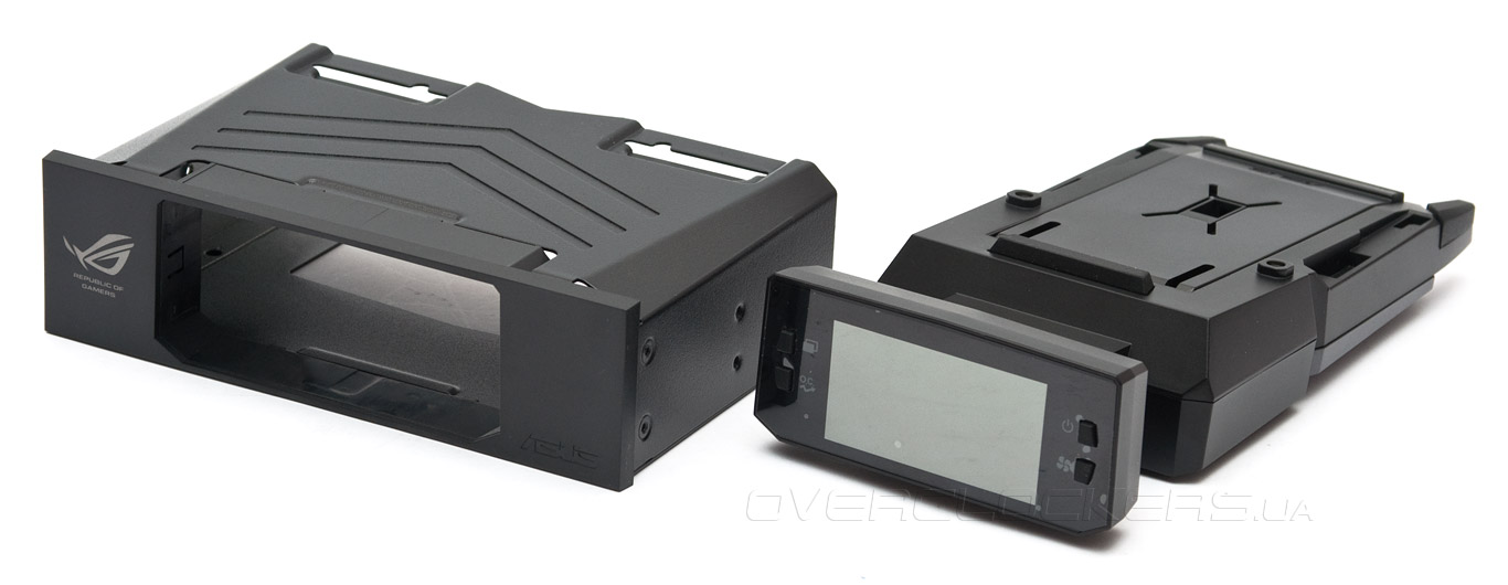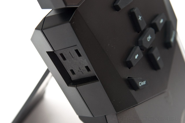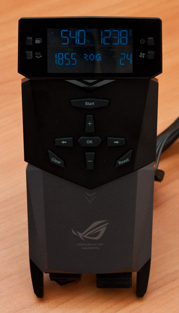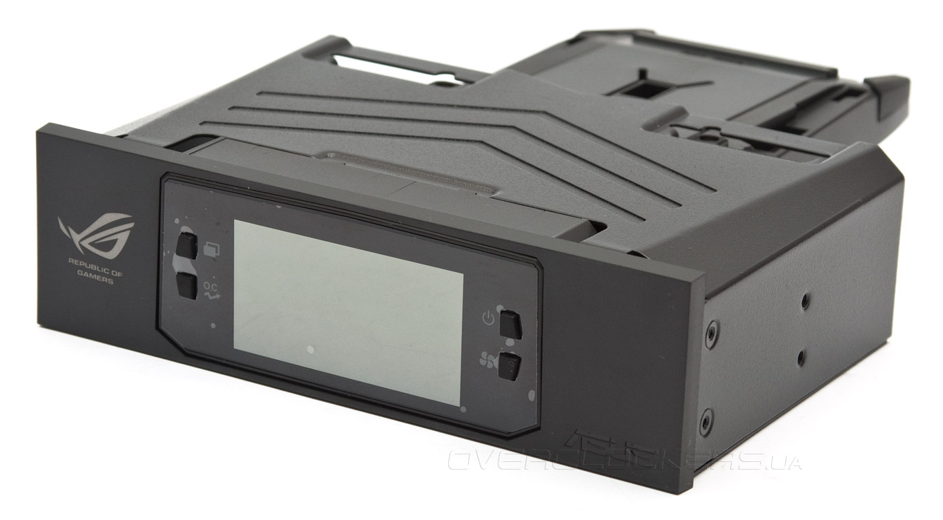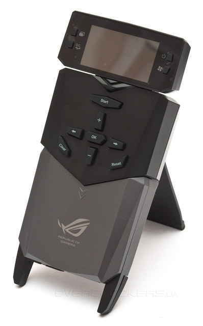 Но самым интересным аксессуаром без преувеличения можно назвать OC Panel в виде пульта управления, заменивший собой OC Key, поставляемый с обычной Rampage IV Extreme. Тем более, что функции у них практически одинаковые, за исключением метода отображения информации и ввода изменений в настройки. Теперь вместо OSD-меню пользователю доступен ЖК-экран, а настройки можно осуществлять благодаря кнопкам на пульте.