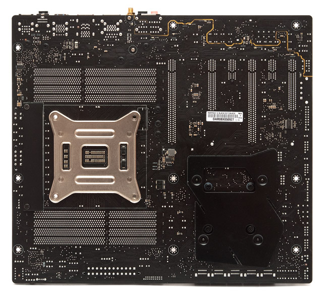 На обратной стороне помимо процессорной усилительной пластины присутствует таковая еще и напротив чипсета. Интересное решение и редко применяемое среди производителей.