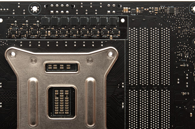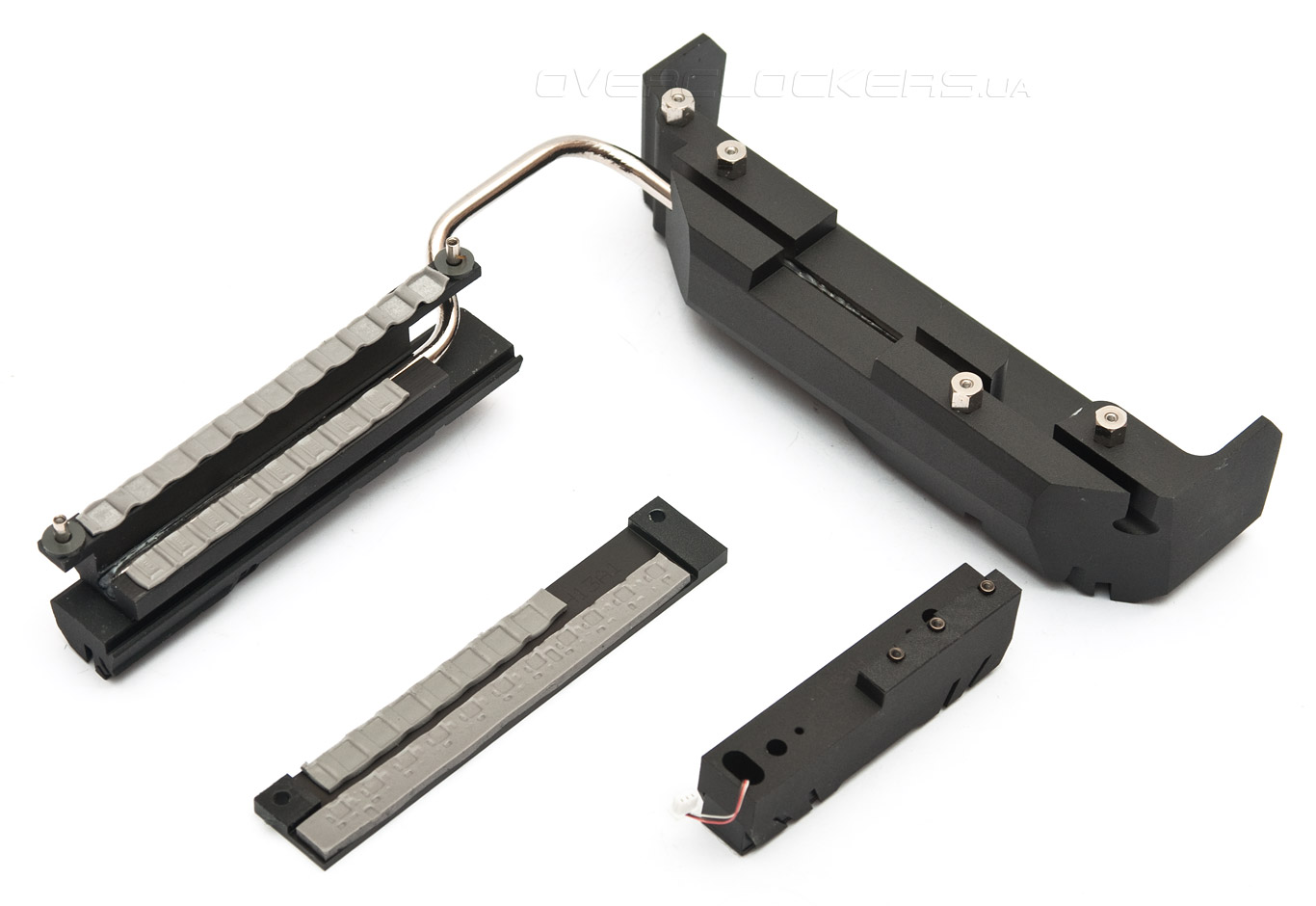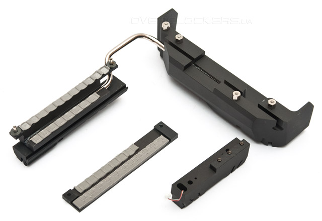 На самом деле, охладитель силовых элементов соединен тепловой трубкой с массивным бруском с выемкой, полностью накрывающим заднюю панель материнской платы. Благодаря своем размерам и массе последний имеет хорошую теплоемкость, тем самым обеспечивая приемлемый тепловой режим модуля VRM.