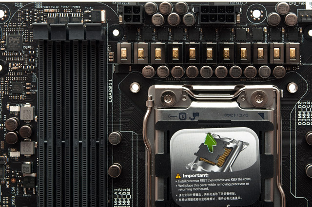 При взгляде на околосокетное пространство возникает легкое недоумение, ведь силовые элементы охлаждает совершенно миниатюрный радиатор, как для такого мощного решения.