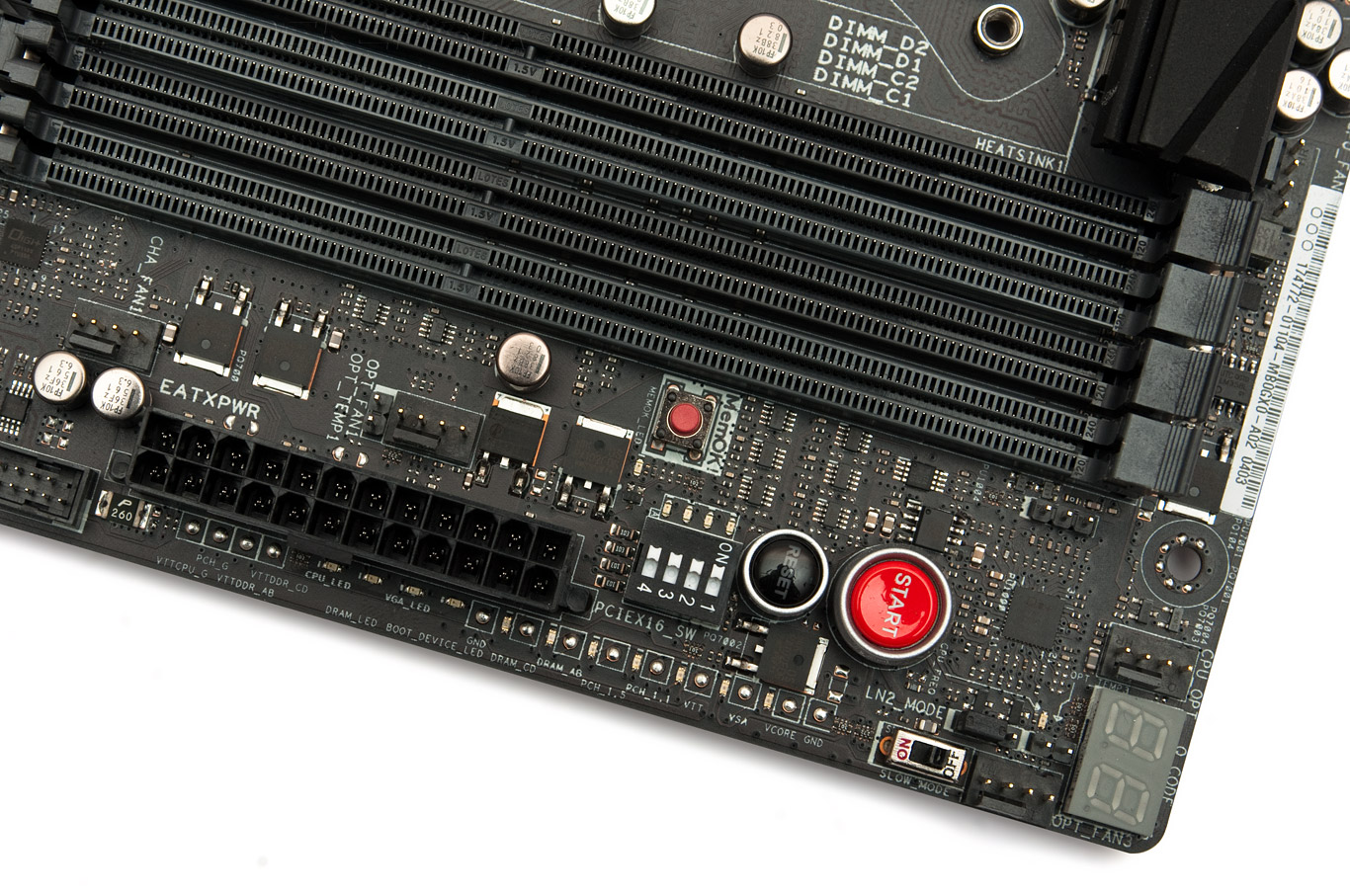 Как и все решения серии Republic of Gamers материнская плата Rampage IV Black Edition оснащена необходимой функциональностью, упрощающей как обычный разгон, так и экстремальный с использованием жидкого азота. В верхнем правом углу PCB расположились кнопки включения и перезагрузки, индикатор POST-кодов, контакты для снятия показаний всех ключевых напряжений, среди которых находятся индикаторы состояния системы, джампер для сдвига температуры «колбута». Там же нашли место DIP-переключатель для отключения разъемов PCI Express x16 и кнопка MemOK!, отвечающая за одноименную функцию, позволяющую загрузить систему с проблемным модулем памяти. Есть также знакомый по многим продуктам ASUS переключатель Slow Mode.