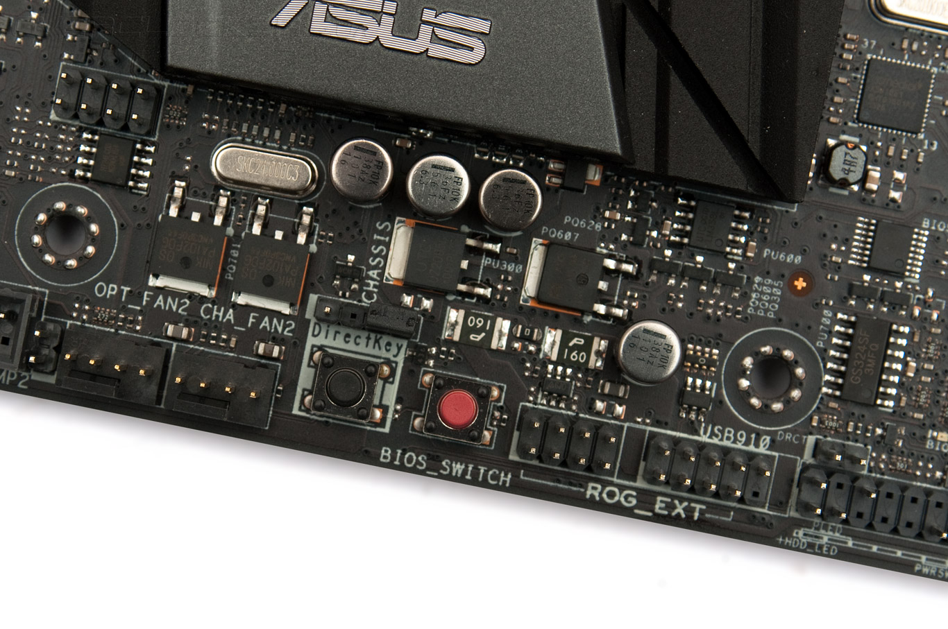 На нижнем крае находятся кнопки переключения между микросхемами с прошивками платы (BIOS_SWITCH) и быстрого доступа к настройкам UEFI (DirectKey). Функцию DirectKey вообще можно вынести на переднюю панель благодаря контактам возле колодки Front Panel.