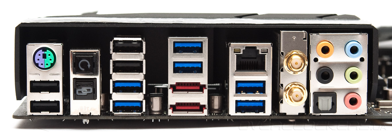 Что касается стандартных возможностей, требуемых от материнской платы как таковой, то наша Black Edition также находится на высоте. Кроме четырех разъемов PCI Express 3.0 x16, способные работать вплоть до формулы «х16+х8+х8+х8», есть еще два обычных PCI-E x1. Дисковая подсистема не ограничена лишь чипсетными SATA-каналами и дополнена еще четырьмя третьей ревизии и двумя eSATA на базе сторонних контроллеров ASMedia. Шина USB 3.0 вообще реализована на чипах этой фирмы, так как системная логика Intel X79 не поддерживает скоростной интерфейс для периферии. В итоге пользователю доступно 10 портов USB 3.0, шесть из которых вынесены на заднюю панель. И это дополнительно к такому же количеству USB 2.0!