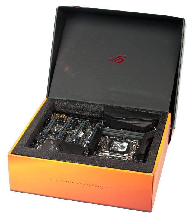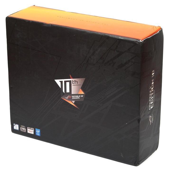 За несколько лет знакомства с Republic of Gamers мы привыкли, что материнские платы этой серии поставляются в крупных красных коробках с ручкой, облегчающей транспортировку, и откидной крышкой-дверцей, через которую можно увидеть приобретаемое устройство. Но с выходом юбилейной модели цветовое оформление немного изменилось — упаковка внешне стала скромнее, а основной черный цвет дополнен желто-оранжевым оттенком.