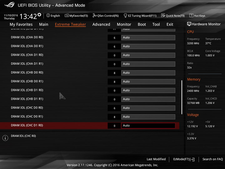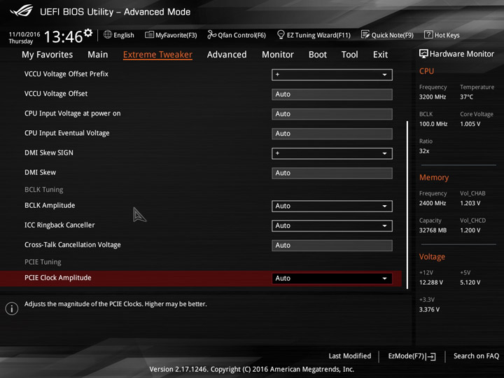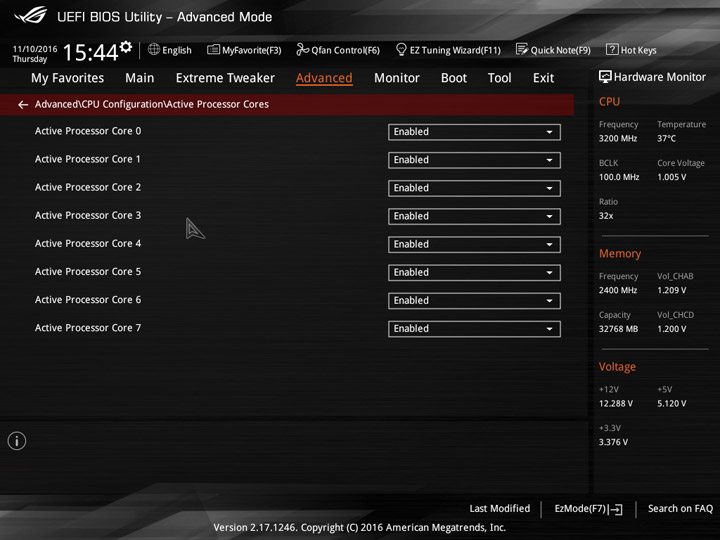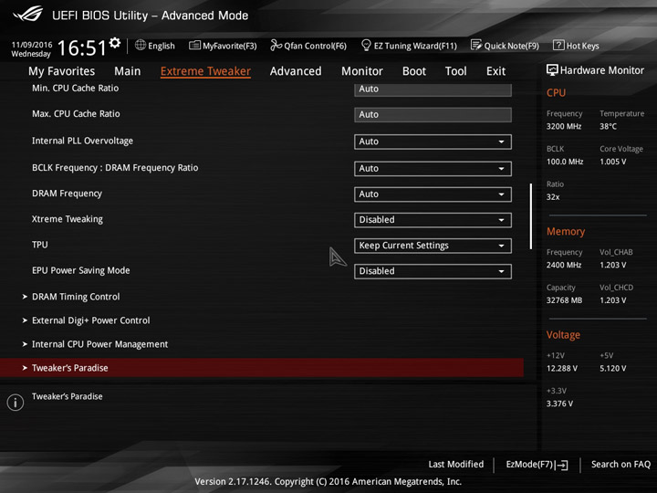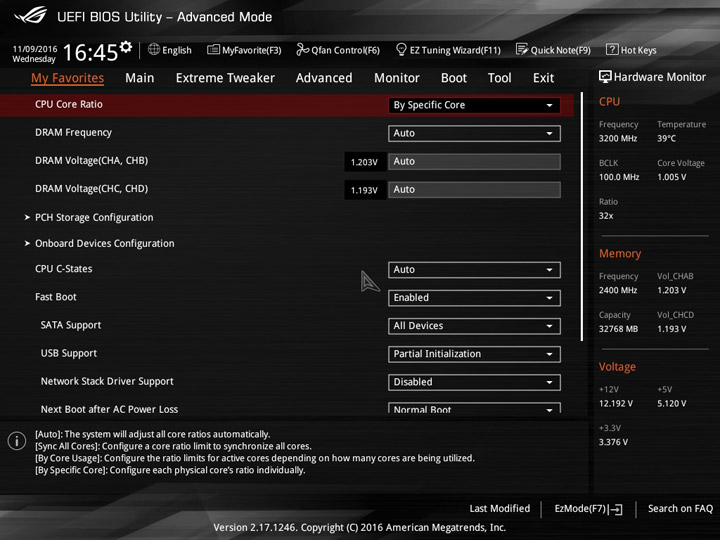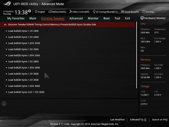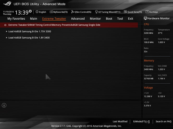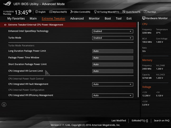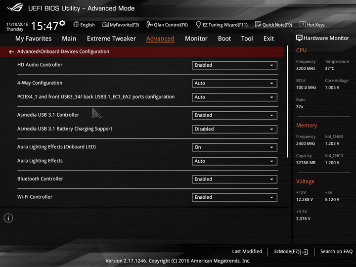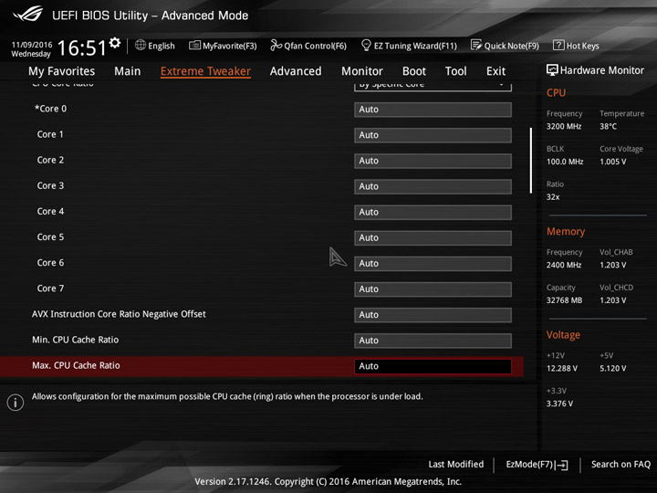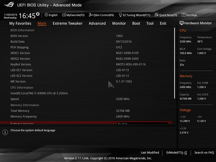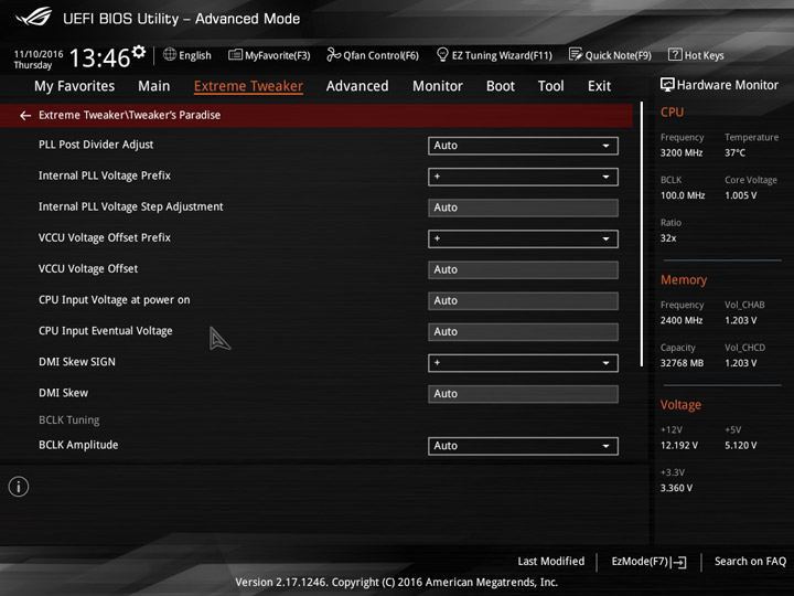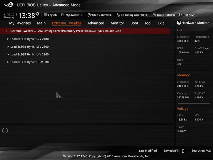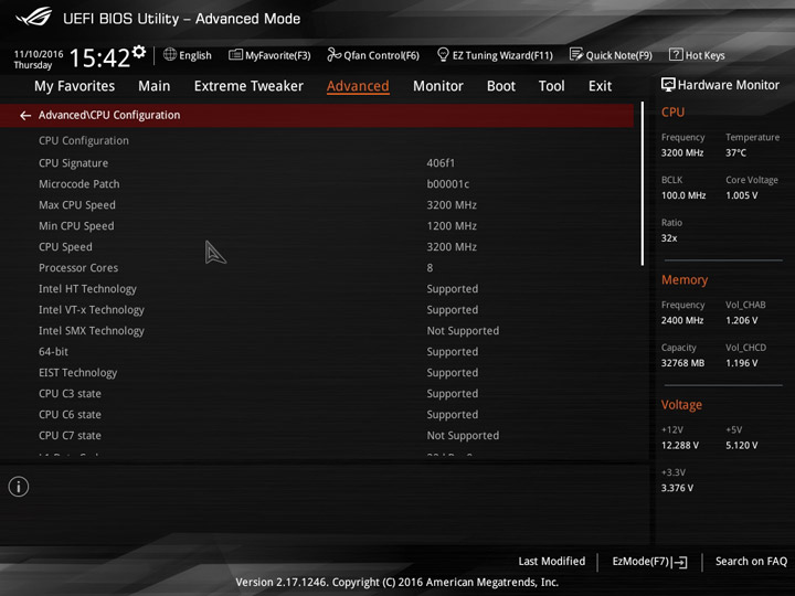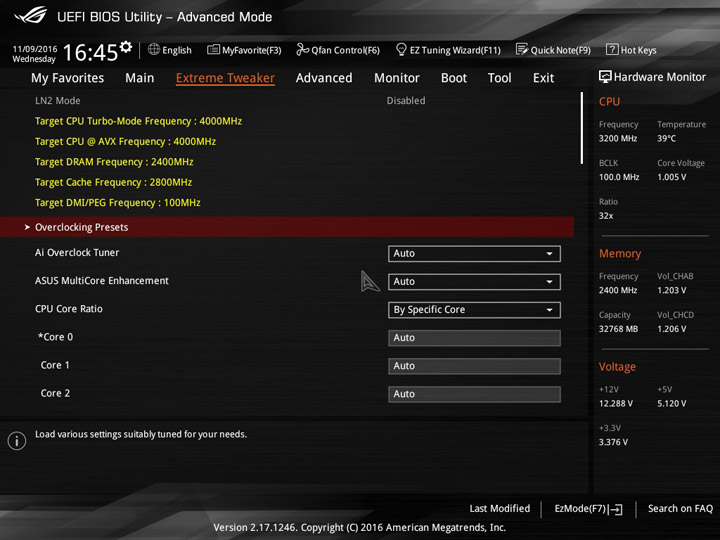 Прошивка рассматриваемой платы основана на переработанном коде AMI UEFI с оригинальным фирменным интерфейсом, присущим серии ROG. При старте системы и входе в UEFI пользователь сразу попадает в раздел Extreme Tweaker, где сосредоточены тонкие настройки платы. Здесь можно отследить частоты ядер CPU, включая режимы Turbo Boost и AVX, кэша, памяти и шины PCI Express, а также настроить множители процессора и режимы работы памяти, всевозможные напряжения.