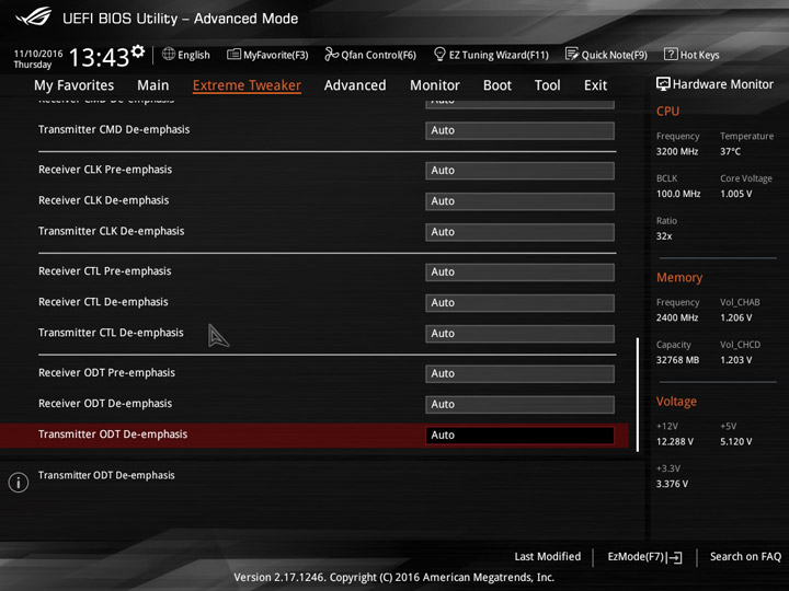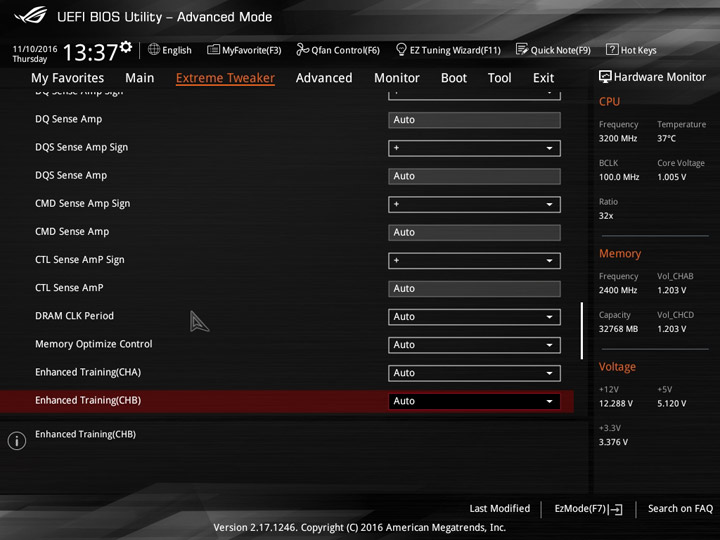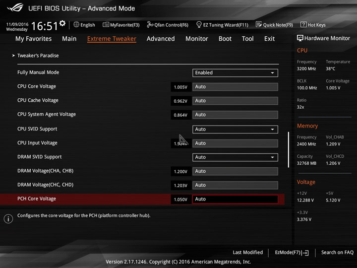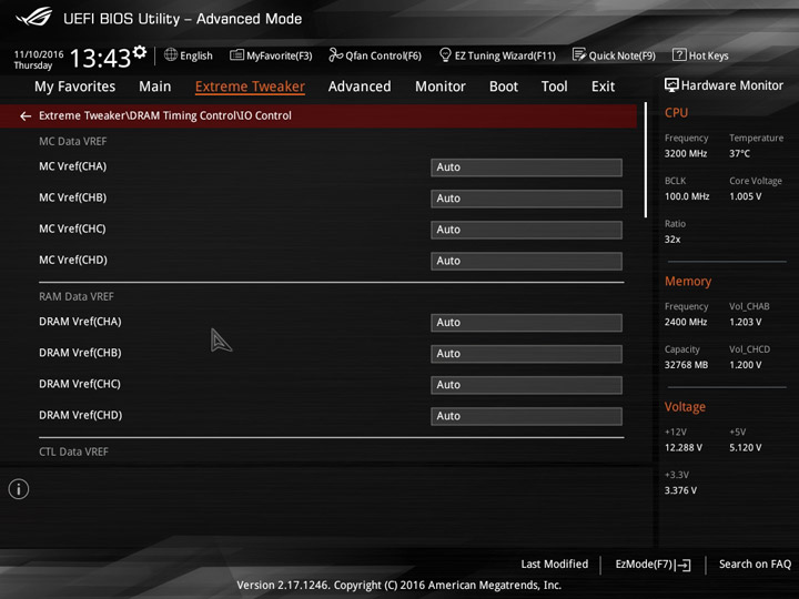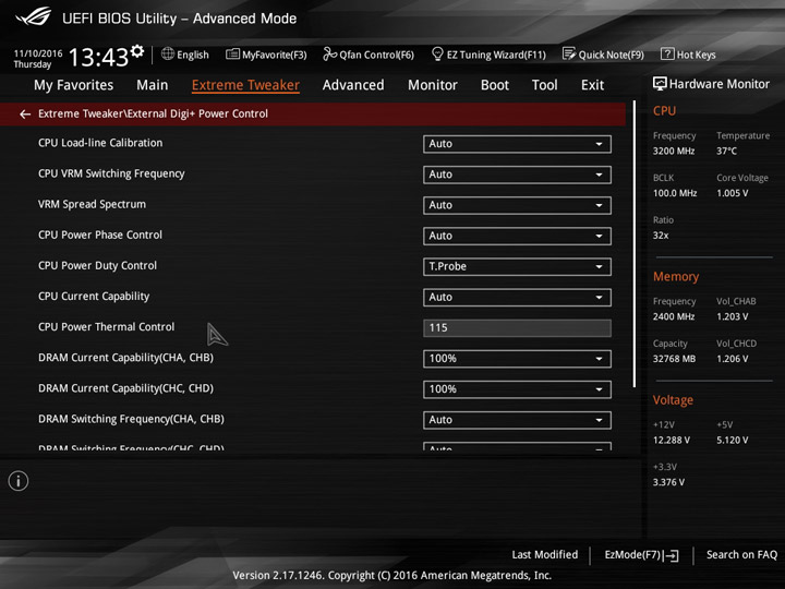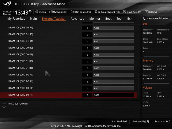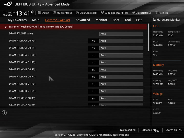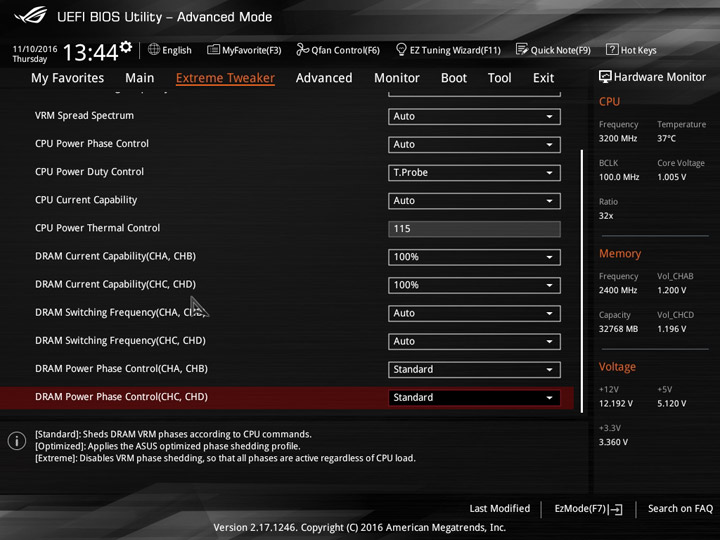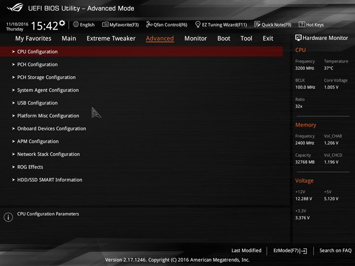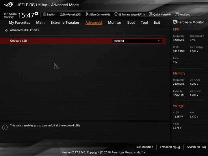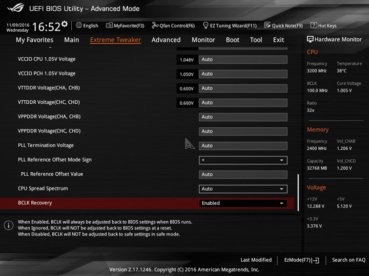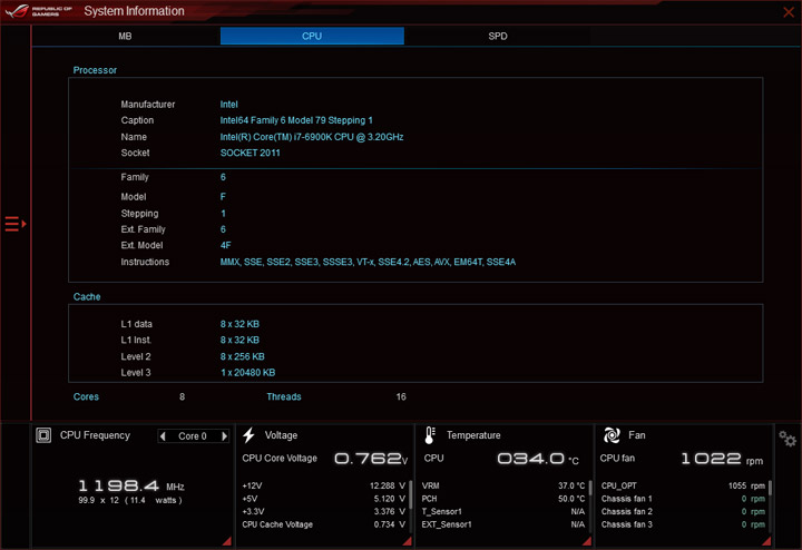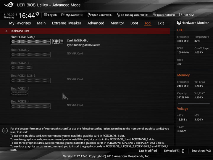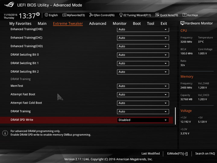 Прошивка рассматриваемой платы основана на переработанном коде AMI UEFI с оригинальным фирменным интерфейсом, присущим серии ROG. При старте системы и входе в UEFI пользователь сразу попадает в раздел Extreme Tweaker, где сосредоточены тонкие настройки платы. Здесь можно отследить частоты ядер CPU, включая режимы Turbo Boost и AVX, кэша, памяти и шины PCI Express, а также настроить множители процессора и режимы работы памяти, всевозможные напряжения.