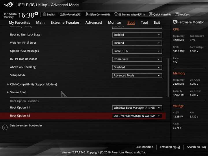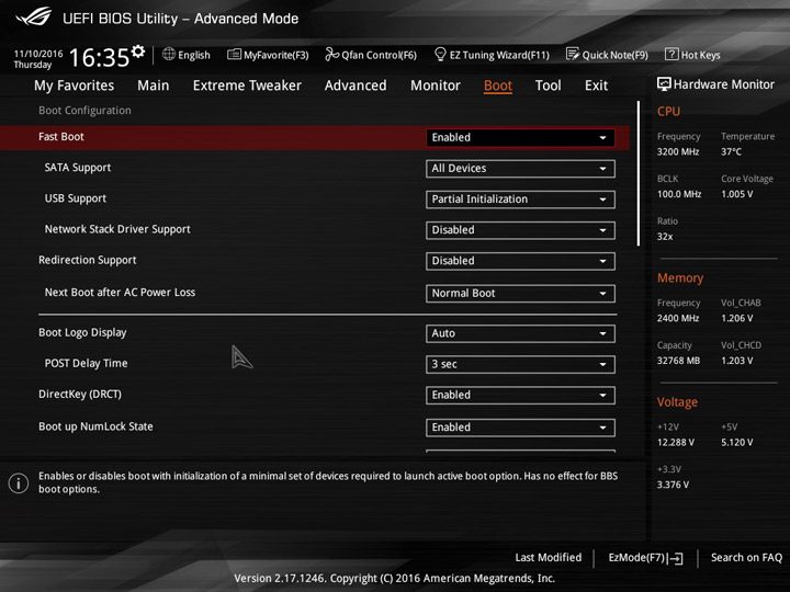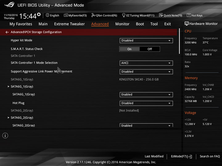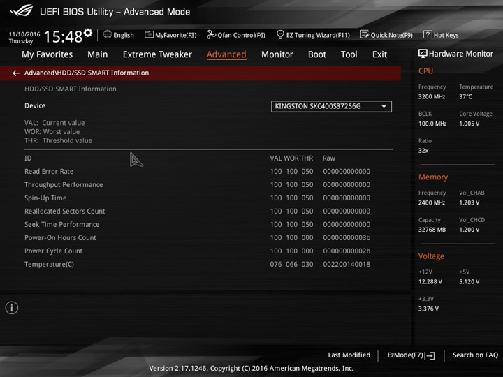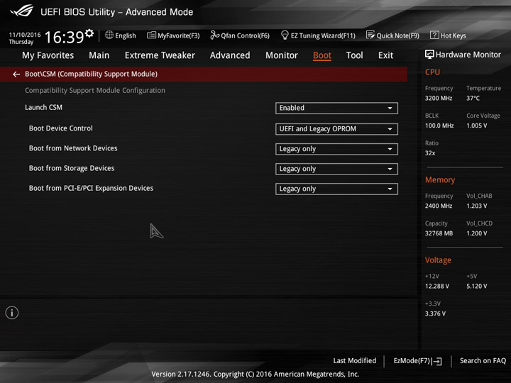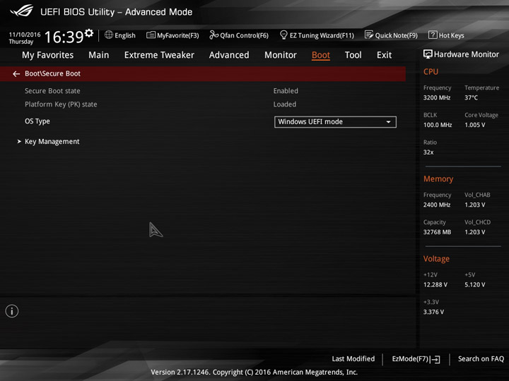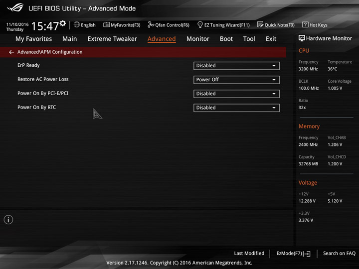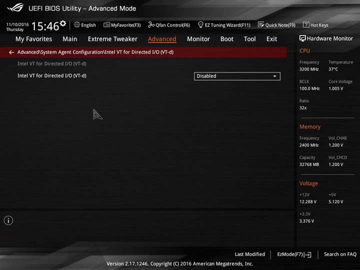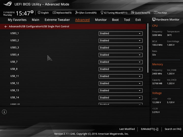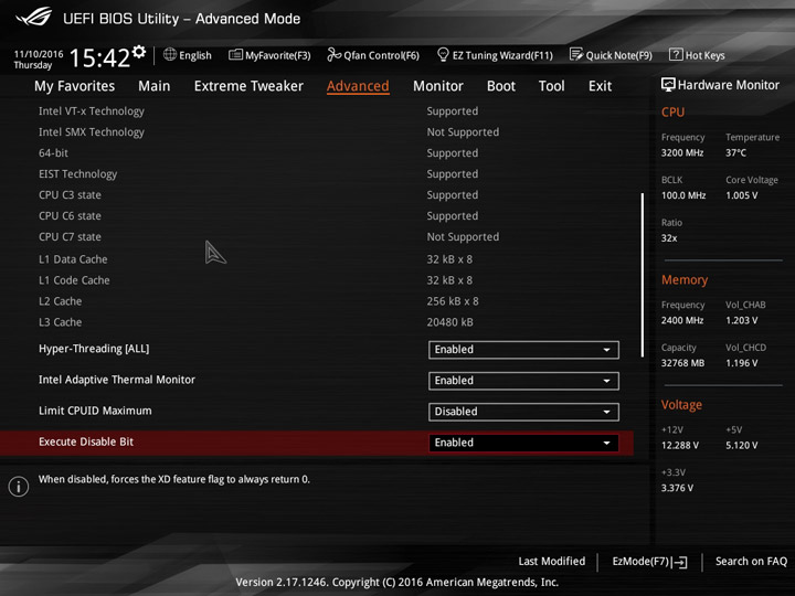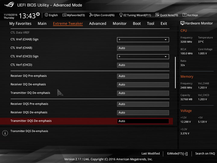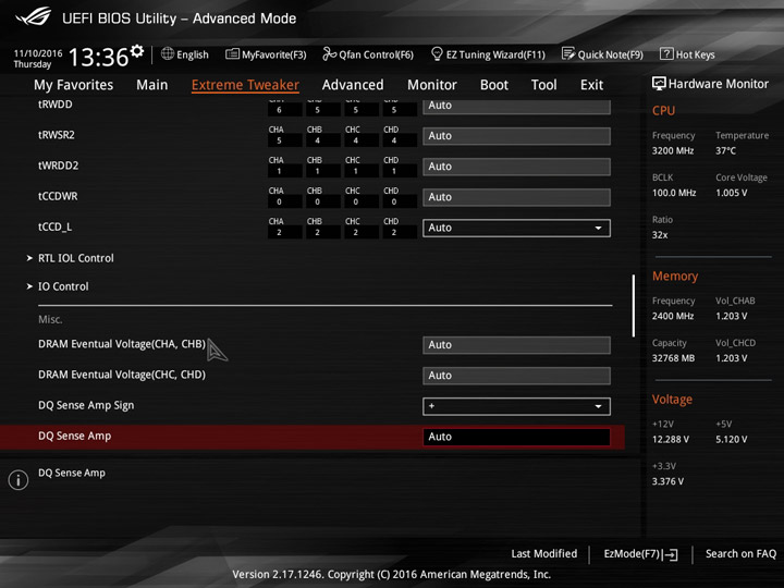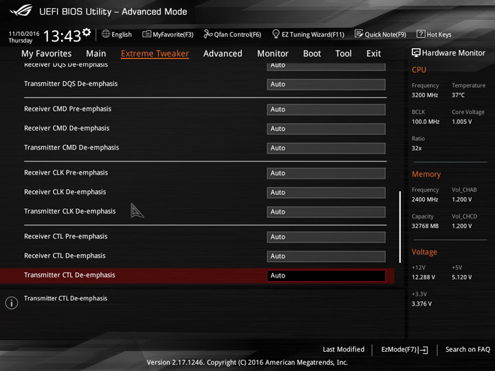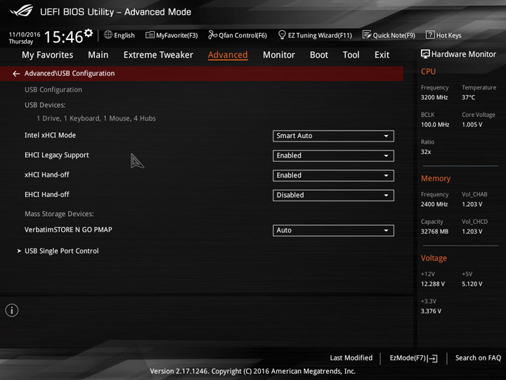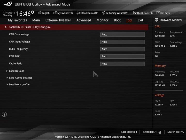 Прошивка рассматриваемой платы основана на переработанном коде AMI UEFI с оригинальным фирменным интерфейсом, присущим серии ROG. При старте системы и входе в UEFI пользователь сразу попадает в раздел Extreme Tweaker, где сосредоточены тонкие настройки платы. Здесь можно отследить частоты ядер CPU, включая режимы Turbo Boost и AVX, кэша, памяти и шины PCI Express, а также настроить множители процессора и режимы работы памяти, всевозможные напряжения.