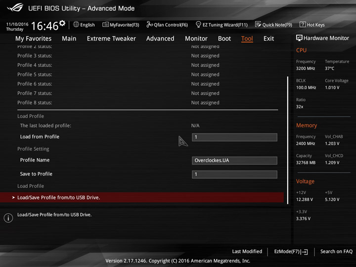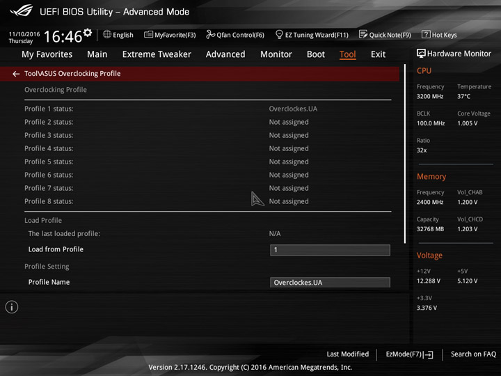А вот фирменные встроенные утилиты, которые так облегчают жизнь пользователям, находятся во вкладке Tool. Самые главные из них — EZ Flash 3 Utility и Overclocking Profile. Первая позволяет произвести обновление микрокода материнской платы, а благодаря второй можно сохранить до восьми профилей с настройками.