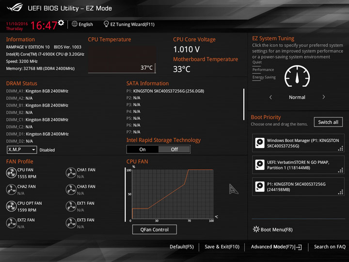 Как видим, материнская плата ROG Rampage V Edition 10 обладает всем необходимым для постройки многофункциональной системы. Осталось узнать, какие возможности она может предложить пользователю на программном уровне, и начнем мы дальнейшее знакомство с рассмотрения прошивки.