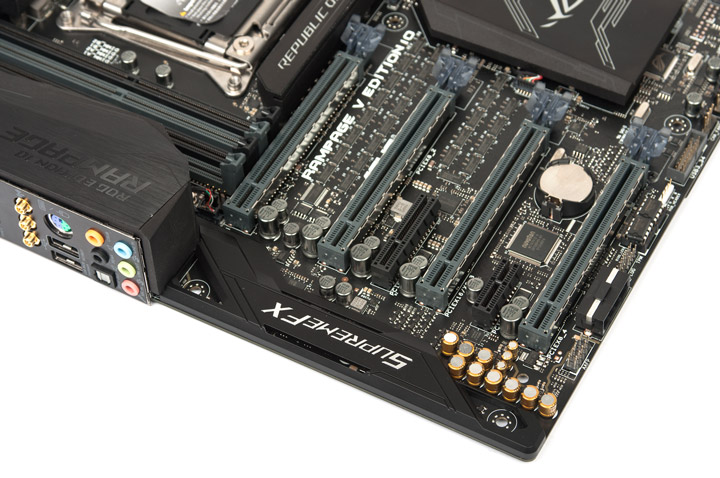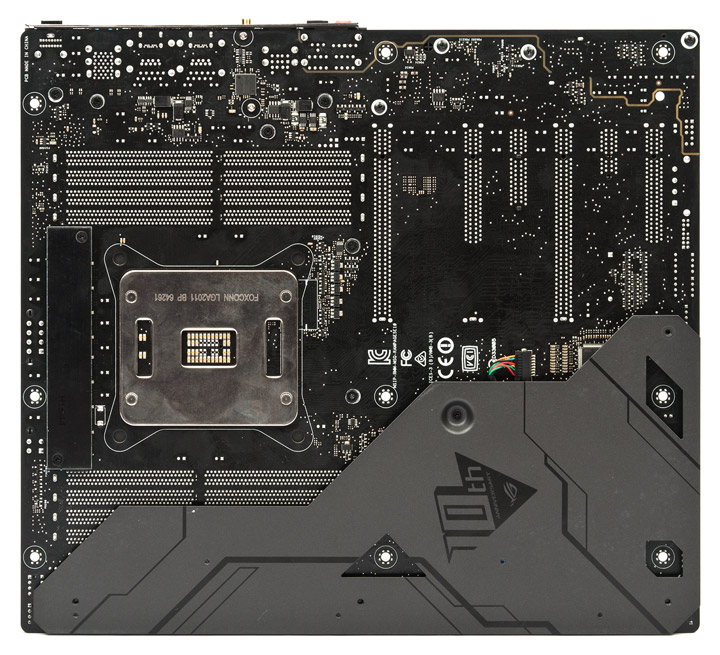 Кроме того, по сравнению с обычной Rampage V Extreme, у новинки теперь появился пластиковый кожух в районе звукового тракта и немного изменилась форма радиаторов. Также защитная пластина под чипсетом на обратной стороне платы прикрывает уже треть PCB по нижнему краю, где расположился световод «ауры». Немного изменилось расположение элементов, некоторые даже отсутствуют, но в целом, это все та же ATX-плата с чуть увеличенной шириной, из-за чего придется аккуратно подключать кабели, особенно питания.