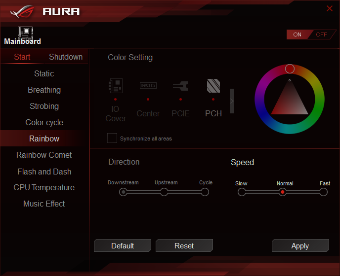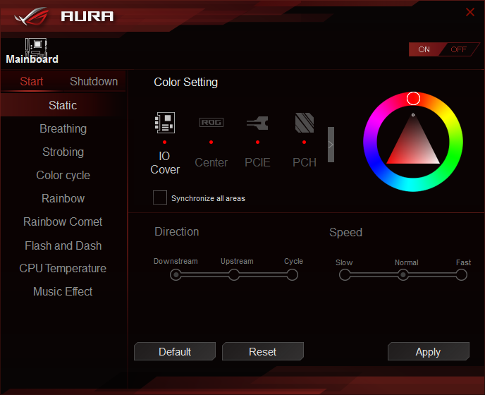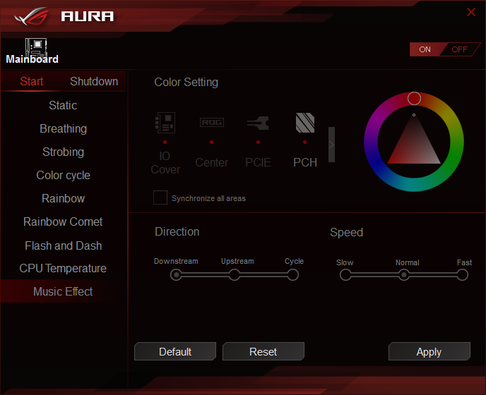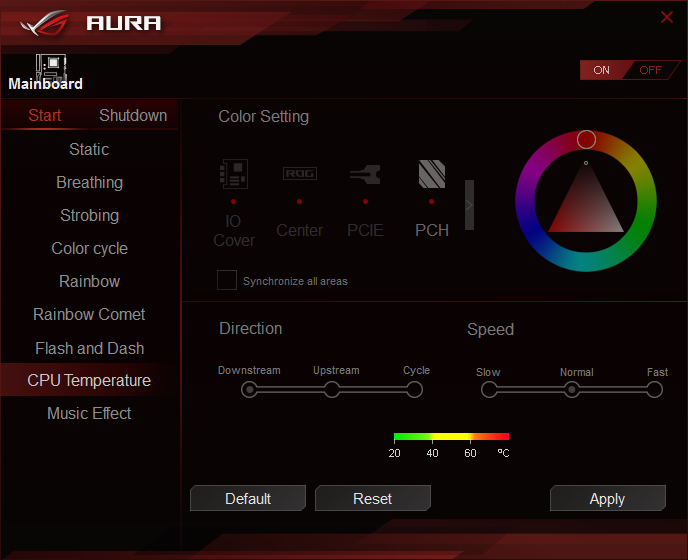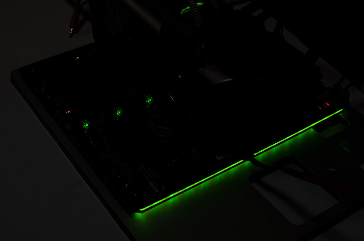 Пользователь с ее помощью может выбрать цвет свечения для каждого элемента (задняя панель, центр, разъемы PCI-E, чип PCH и пять точек под платой) и варианты работы подсветки: от стробоскопа до режима, который зависит от температуры процессора (зеленый, желтый и красный) и даже светомузыкальный. Правда, принцип работы последнего так и не стал понятен, так как он не совпадал с ритмами музыкальных композиций.