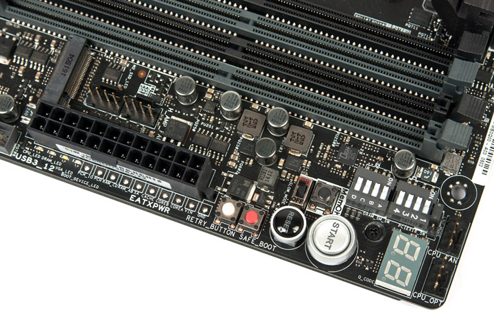 Помимо всего прочего, плата располагает такими функциями как ReTry, аналогичной полному обесточиванию устройства, и Safe Boot, которая позволяет запустить систему с параметрами по умолчанию, сохраняя при этом пользовательские настройки. Ну и, конечно же, MemOK! — благодаря ей можно произвести старт ПК с безопасными параметрами ОЗУ. Любители экспериментировать с микрокодом также оценят наличие двух микросхем с прошивками и кнопки для переключения между ними. Если удастся приобрести внешний модуль OC Panel, то подключив его в соответствующий разъем можно будет управлять материнской платой в еще больших пределах, чем это возможно средствами на ней.