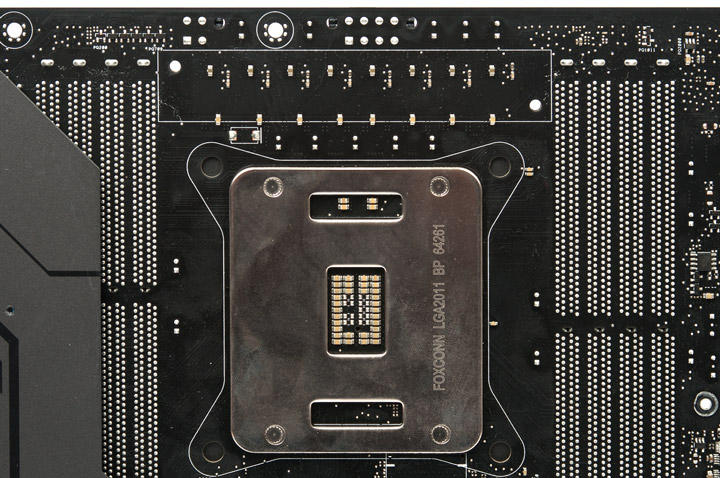 И с этим у платы никаких проблем замечено не было. Охлаждение элементов преобразователя питания CPU осуществляется за счет алюминиевого радиатора-бруска, который при помощи тепловой трубки сообщается с еще одним, частично накрывающим заднюю панель «материнки». На обратной стороне PCB, в зоне повышенного нагрева, предусмотрена пластинка, которая несет скорее чисто механические функции, чем охлаждающие. Еще один, декоративный, обладающий подсветкой, элемент установлен между гнездом процессора и слотом PCI Express. В былые времена здесь, как правило, располагался северный мост набора системной логики.