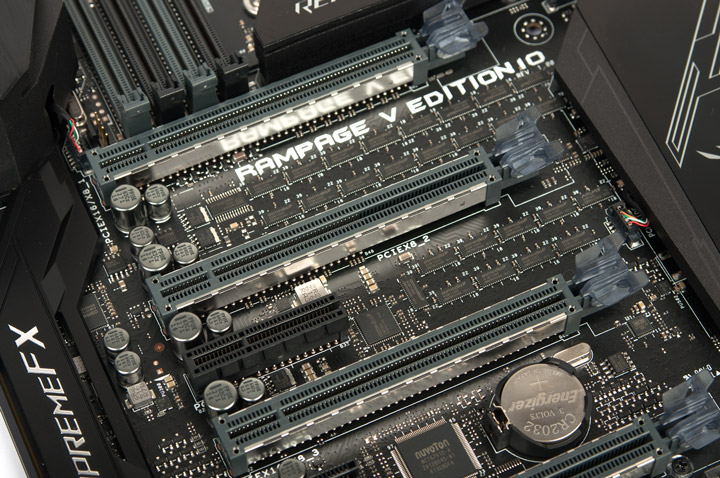 Несмотря на то, что ROG Rampage V Edition 10 приобрела более «игровые» черты, она не лишилась возможностей по разгону системы. На ней даже было поставлено несколько рекордов в мировом рейтинге оверклокинга на HWBot.org. Для облегчения пуска системы и наблюдения за ее состоянием на плате установлены кнопки включения и перезагрузки, индикатор POST-кодов, набор светодиодов Q-LED, сигнализирующих о процессе инициализации основных узлов ПК. При разгоне также будут не менее полезны точки замера основных напряжений, а во время экстремального оверклокинга возможность отключать слоты памяти и PCI-E, и режим Slow Mode, позволяющий загрузить ОС при меньшей частоте процессора. В последнем случае в обязательном порядке должна быть установлена перемычка LN2 Mode, которая еще и открывает доступ к более высоким напряжениям в UEFI, чем предусмотрено по умолчанию.