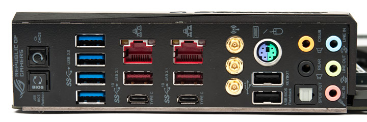 На задней панели материнской платы находятся все современные разъемы в достаточном количестве. Здесь есть четыре порта USB 3.1 Gen1, по два USB 3.1 Gen2 Type A и Type C и два обычных, версии 2.0. Последние позволяют воспользоваться технологией Flashback для автоматического обновления прошивки, достаточно вставить в разъем «флешку» с предварительно сохраненным микрокодом и нажать кнопку BIOS Flashback, и KeyBot, наделяющей любую клавиатуру возможностью записи макрокоманд и назначения «горячих клавиш». Присутствуют также привычный универсальный PS/2 и кнопка Clear CMOS. Еще шесть «мини-джеков» с оптическим выходом позволят реализовать 7.1-канальную аудиосистему, а три антенных разъема от двухдиапазонного модуля ASUS Wi-Fi Go! обеспечат скорость передачи беспроводной сети до 1300 Мбит/с. Обычная сеть представлена двумя гигабитными портами.