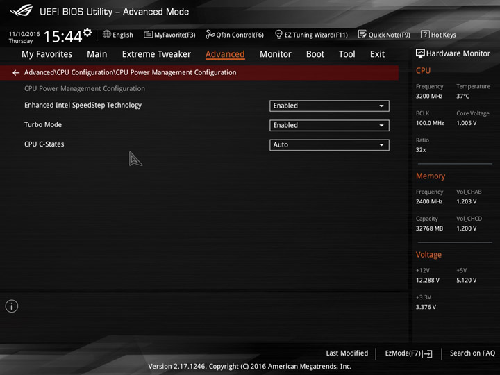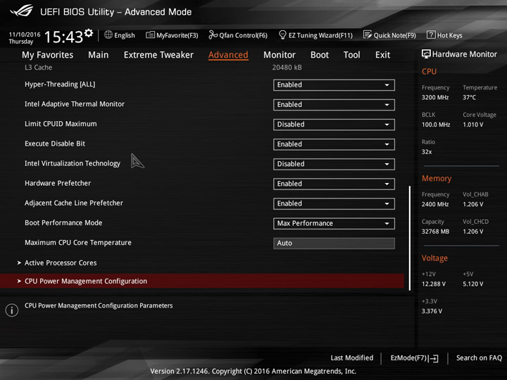 Посмотрим для начала функционирование платы с настройками по умолчанию. При работе системы по дефолту материнская плата форсирует процессор на максимальную производительность и выставляет множитель x37 для всех ядер, кроме одного, во время задействования 16 потоков. Одно же ядро функционирует с коэффициентом х40, соответствуя требованиям технологии Turbo Boost Max 3.0.