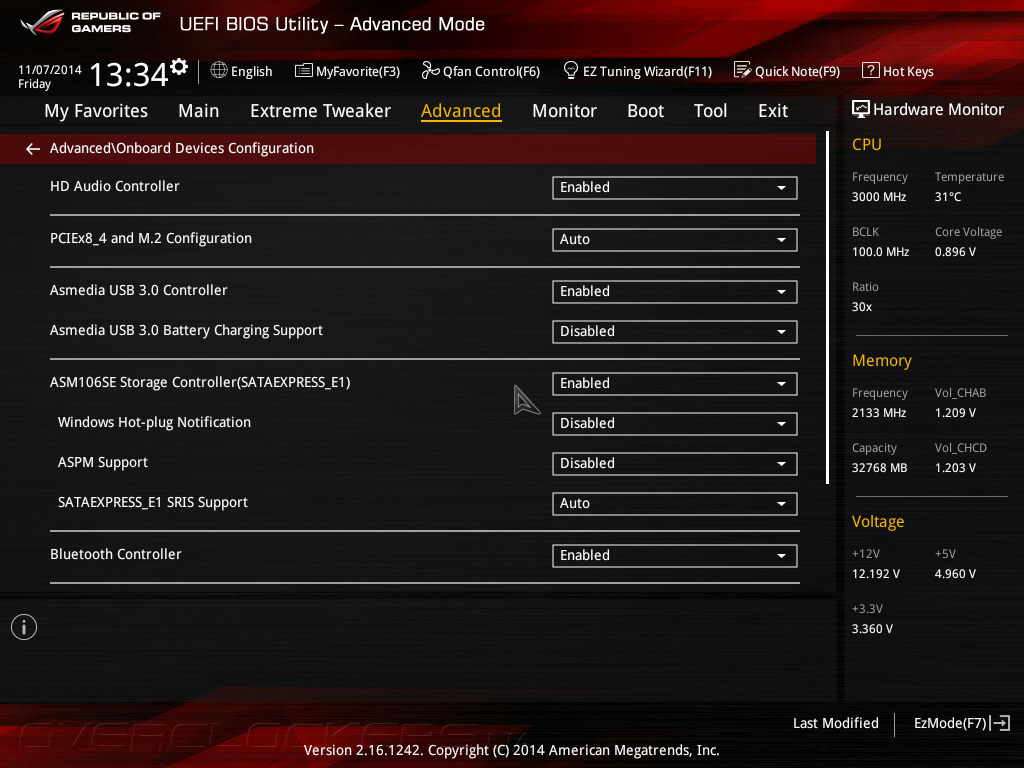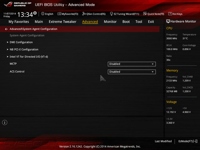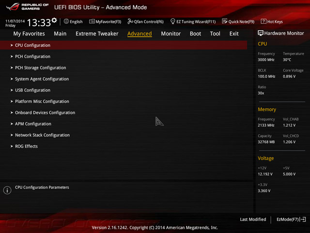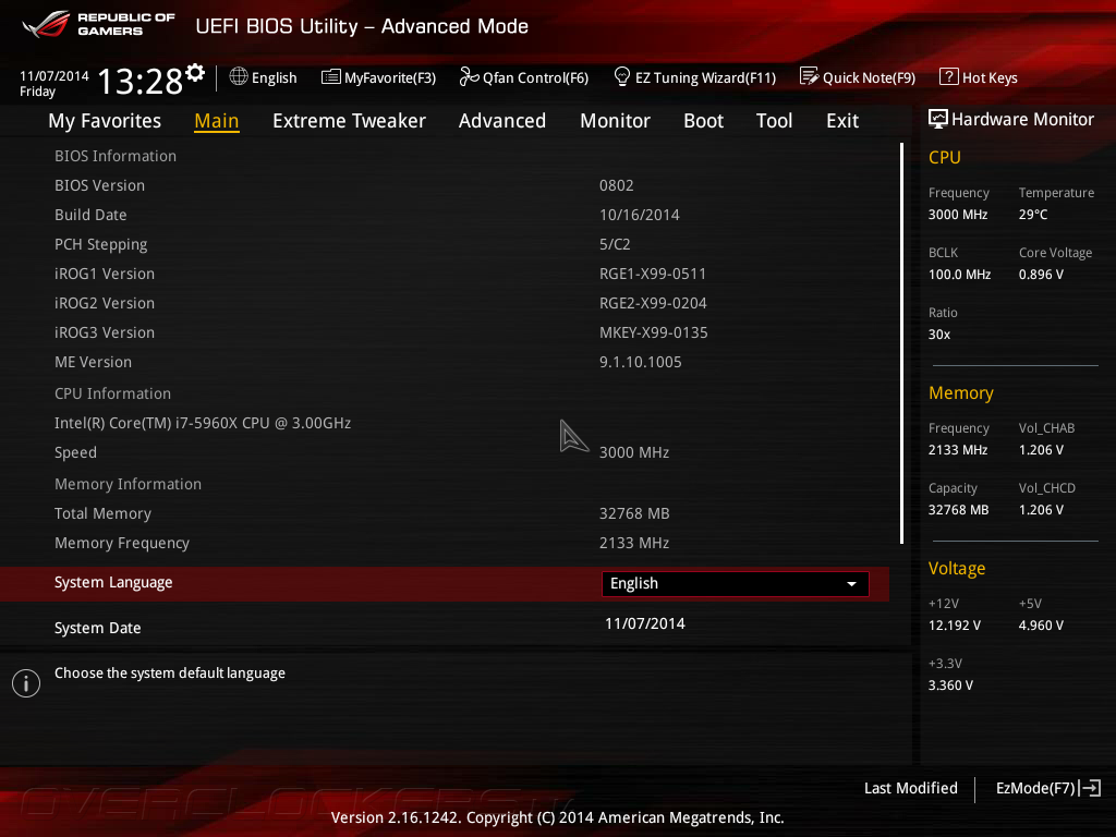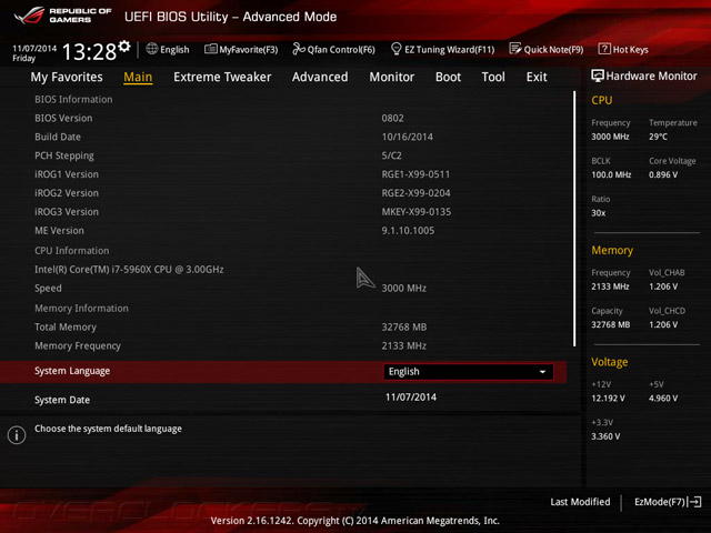 Системная плата Rampage V Extreme оснащается прошивкой, в основе которой лежит микрокод UEFI разработки компании AMI. Место стандартного меню настройки Aptio занял оригинальный интерфейс, оформление и функциональность которого знакомы нам из предыдущих обзоров решений ASUS игрового семейства ROG. Интерфейс имеет два режима: графический EZ Mode, в котором доступны лишь базовые настройки, и Advanced Mode, дающий полный контроль над всеми параметрами прошивки. В продвинутом режиме после входа в UEFI Setup открывается вкладка Main, где устанавливаются дата и время, показываются сведения о версии управляющего микрокода, а также задается язык отображения меню. В правой части окна отображается информационная панель, на которую выводятся показания аппаратного мониторинга и текущего режима быстродействия системы.