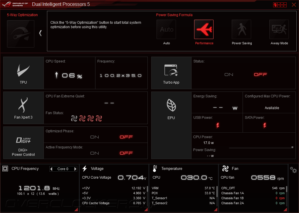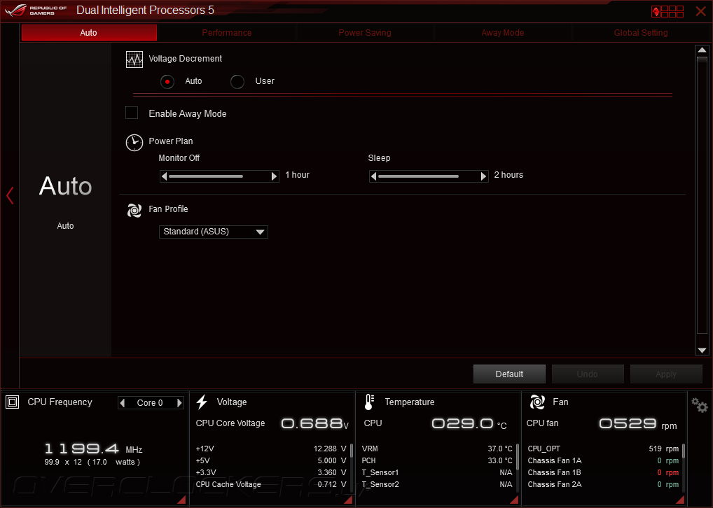 За настройки продуктивности и управление режимом работы вентиляторов отвечает подпрограмма Dual Intelligent Processor 5, интерфейс которой состоит из отдельных функциональных модулей.