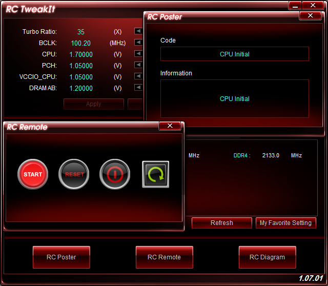 Помимо RC TweakIT пользователям предлагается программный модуль RC Poster, предназначенный для отображение кодов POST, и подпрограмма RC Remote, которая дает возможность управлять питанием материнской платы, выполнять перегрузку и даже сбрасывать настройки прошивки.