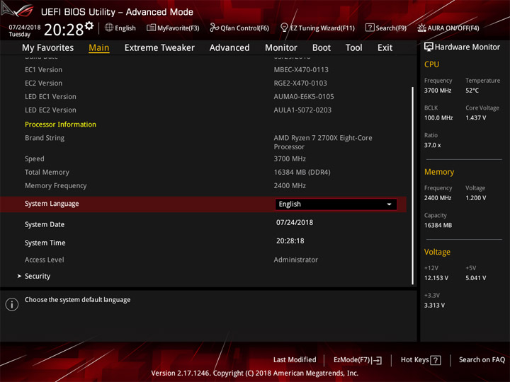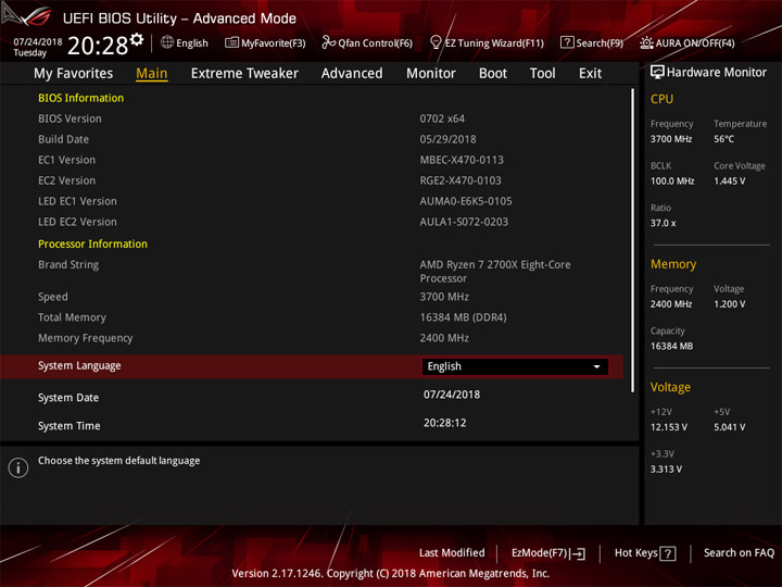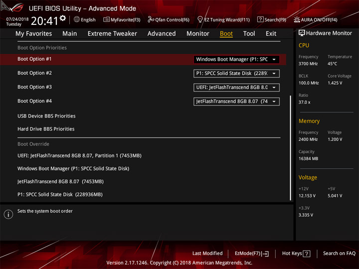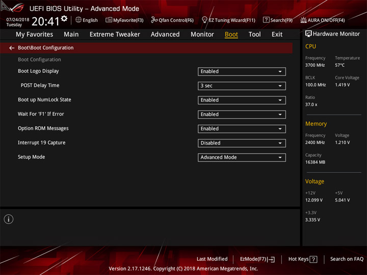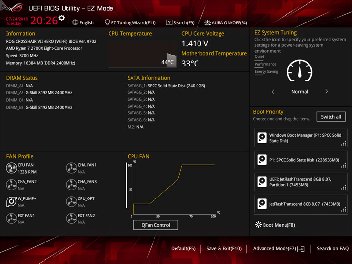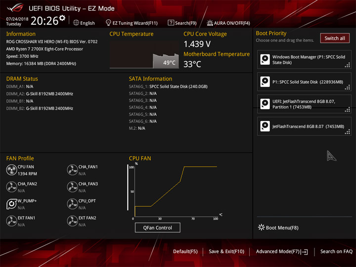 Внешний вид меню UEFI не менялся. Есть два режима работы с настройками. Упрощённый поможет выбрать загрузочное устройство и получить базовую информацию о системных компонентах и режимах их работы.