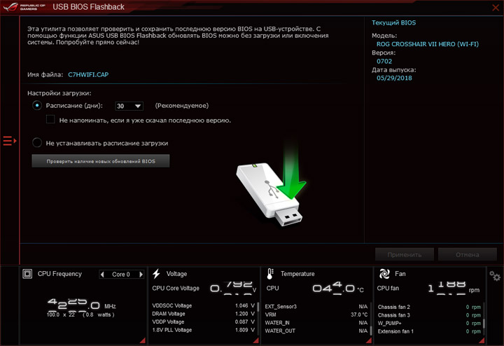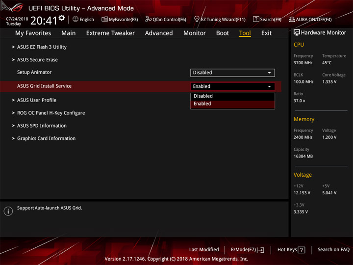 Широкий спектр фирменных утилит оказался дополнен новинкой — ASUS Grid Install Service. Этот механизм запустит помощник в среде Windows 10 для загрузки необходимых системе драйверов. Прежние пункты давно знакомы, но оттого пользы от них не убавилось, весьма удобно использовать профили с хранимыми состояниями системы при экспериментах с оверклокингом. На месте и помощник по обновлению прошивки.
