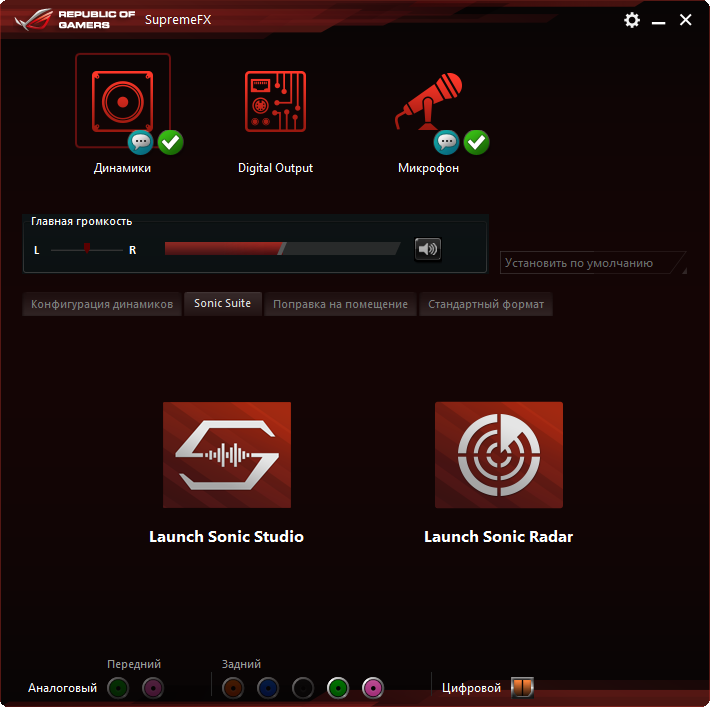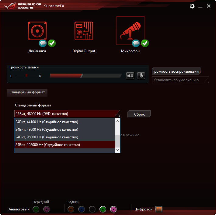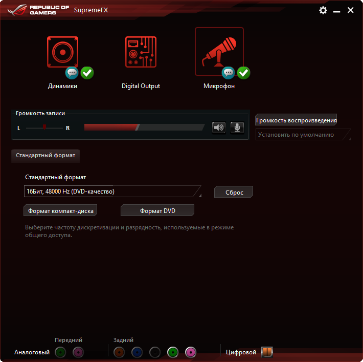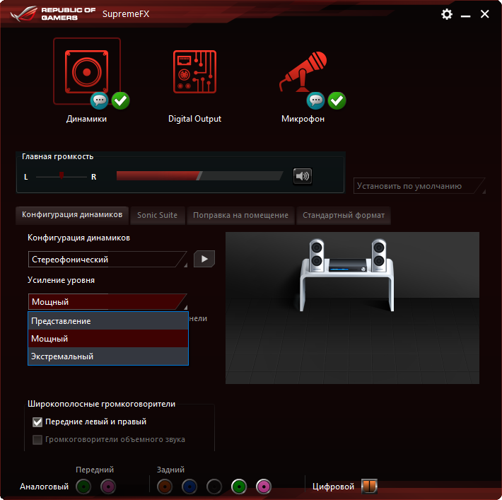 Первичная настройка звучания проходит при участии конфигуратора от Realtek. Есть профили предусиления выходного сигнала в числе трёх и два типа оборудования (актуально для задней панели). При выборе там «Наушников» звук становится немного громче.