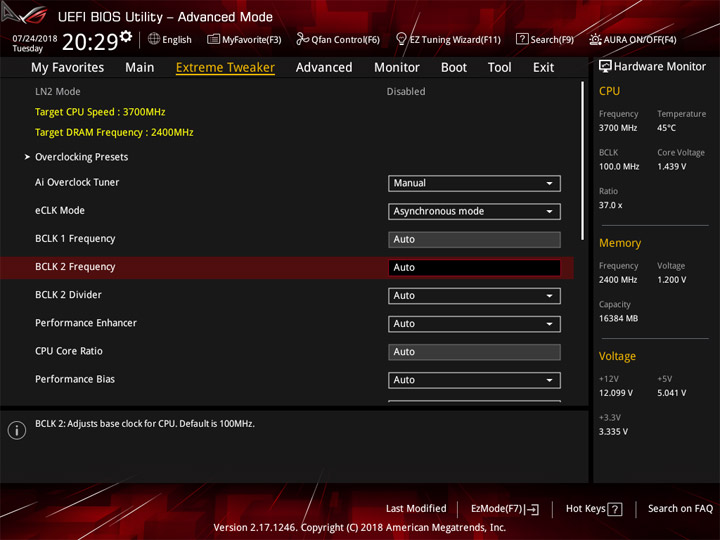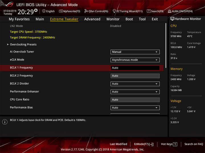 Структура рубрики для разгона компонентов включает множество вкладок и подменю. Имеется ряд готовых профилей и механизмов по оверклокингу всей системы или отдельных её составляющих. Одна из ключевых особенностей — развязка по двум независимым каналам опорной частоты для DRAM с PCI-E (1) и процессора (2).