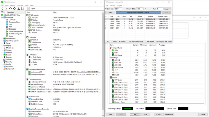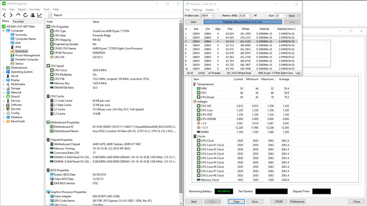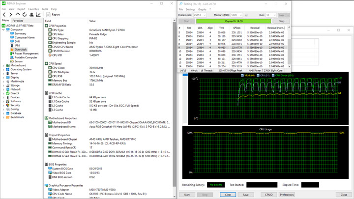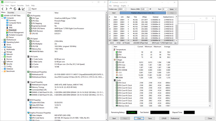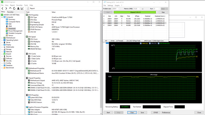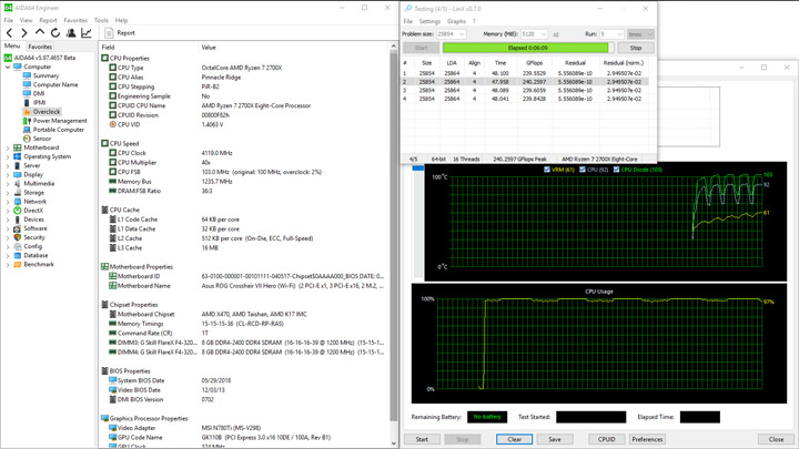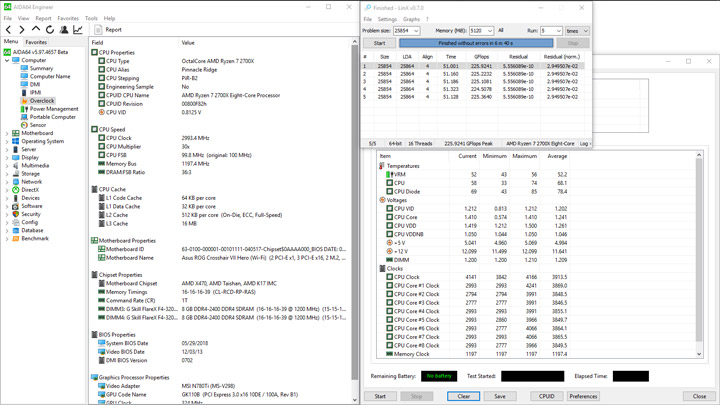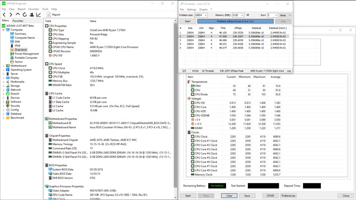 Краеугольным камнем при оверклокинге процессора является этап проверки системы на стабильность. Тут важно точно определить цели или, если угодно читателю, желания пользователя. Тестовые утилиты и типы сценариев ярко воздействуют на картину событий. Учитывая главную цель этого тестирования — изучение потенциала материнской платы —нагрузка создавалась посредством LinX, сперва разгон ЦП я проводил без правки схемы работы ОЗУ, то есть частота равнялась 2400 МГц. Удалось зафиксировать стабильность с множителем x41.25. Это является свидетельством действительно более высокого потенциала кристалла в сравнении с прежде протестированным R7 2700.