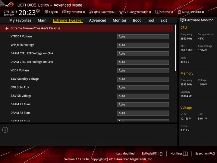 Разгон DRAM оказался сопряжён с массой проблем. Я потратил немало времени, но добиться стабильной работы от набора на частоте 3600 МГц так и не смог. Пришлось смириться с 3533 МГц, потому эффект от использования лучшей на рынке платы оказался немного приправлен горечью. Но даже тут к ней возникли вопросы. Уровни напряжений пришлось подбирать буквально с точностью до сотых вольт, иначе в работе система теряла стабильность. К примеру, SOC Voltage повышенный до 1,1 В уже оказывался избыточным, а 1,05 В — недостаточным. То же относится и к напряжению на модулях — недостаточное справедливо ведёт к ошибкам, но вот когда это происходит с чуть более высоким — становится немного не по себе. Всё это требуется дозаправить поиском стабильной частоты ЦП, на выходе получим три напряжения, которые нужно щепетильно подобрать (излишне высокое на процессоре приводило к росту температуры выше 100 °С под одним из лучших воздушных кулеров на рынке). Итогом изысканий стал аналогичный младшей модели ЦП множитель — x39.50.