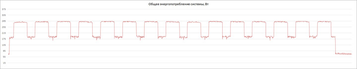 Нагрев подсистемы питания у испытуемой фактически не поменялся в ходе этих двух тестов, она показывала полную уверенность. Очевидна её готовность к самым серьёзным, экстремальным нагрузкам. Собственными силами мне удавалось найти участок, горячее на четыре градуса относительно показаний датчика, но это не будет удивительным, ведь на устройстве фактически два сектора с элементами питания, удалённых друг от друга. Верхняя грань радиатора не грелась больше 49 °C. Границы потребления составили 70 и 296 Вт; тут я напомню про другой БП, используемый в ходе тестов, потому прямое сравнение с другими результатами не будет корректным.