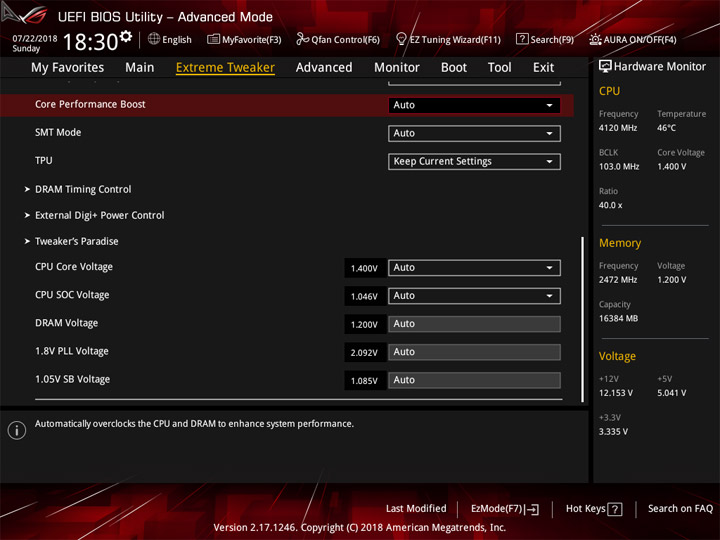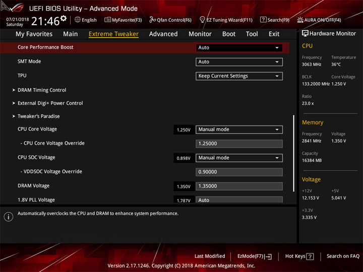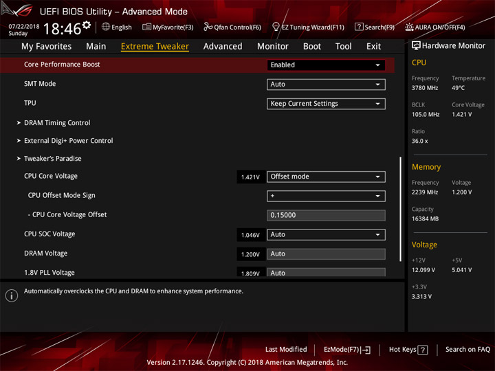 Как мы смогли убедиться, ROG Crosshair VII Hero (Wi-Fi) обладает солидным запасом по мощности VRM и внушительным списком переменных в UEFI. Однако вопрос достижения предельной мощности системой остаётся открытым. Компания AMD реализовала аналог схемы увеличения продуктивности ЦП известного всем как Turbo Boost. У конкурентов она доступна для изменений, как во второй, так и в третьей версии технологий, когда можно менять множители для ядер в том или ином виде. Для продукции AMD это до сих пор остаётся невозможным. Разгон всех ядер на кристалле по общей схеме приводит к утрате высокой производительности на смешанном типе нагрузки либо при несложном её характере, когда работает одно или два ядра. Предлагаю ознакомиться с подходами инженеров ASUS, возможно, они смогли выработать нечто интересное.