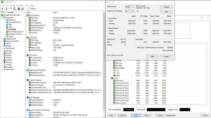 Задержки оказались снижены до отметок «15», если говорить основные. Итоговая частота CPU перевалила за 4100 МГц, его напряжение не превысило 1,4 В. Но и этого хватило для устрашающего разогрева R7 2700X более чем до 100 °C. Система демонстрировала полную работоспособность.
