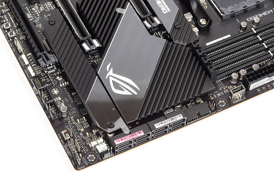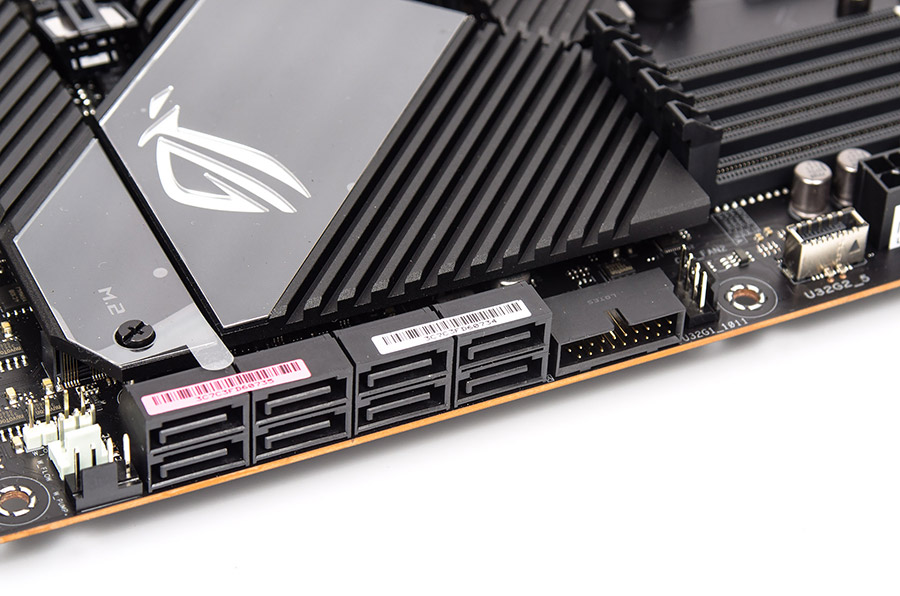 У торца находятся восемь продольных портов SATA. Ресурсов чипа X570 для всего достаточно, нет пересечений чего-то с чем-то, как это происходит на платах с хабом B550, иными словами, использовать можно всё сразу без каких-либо ограничений.