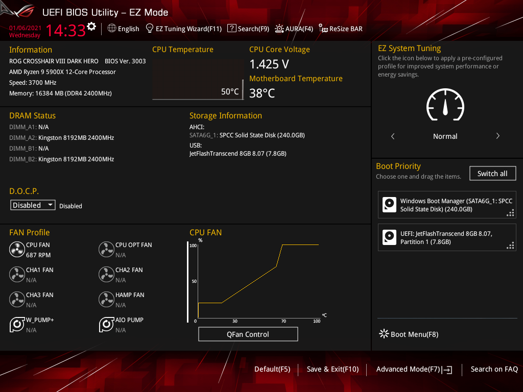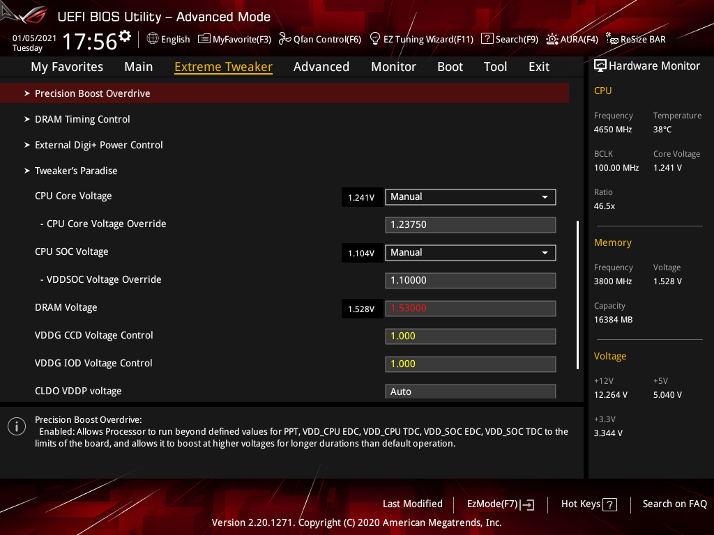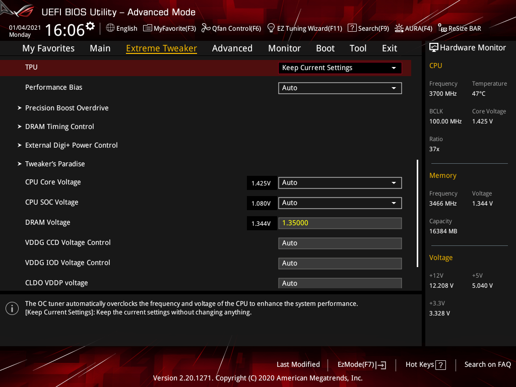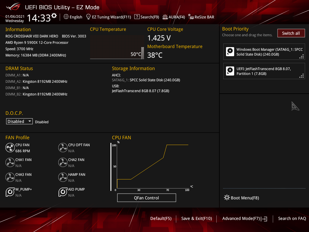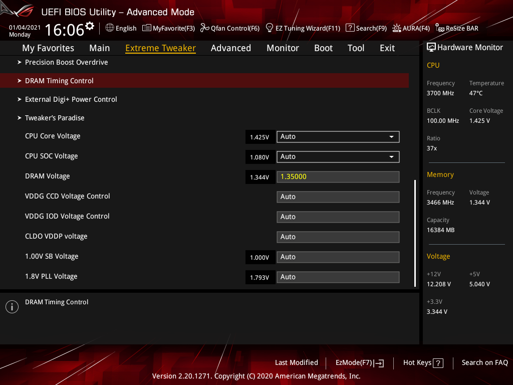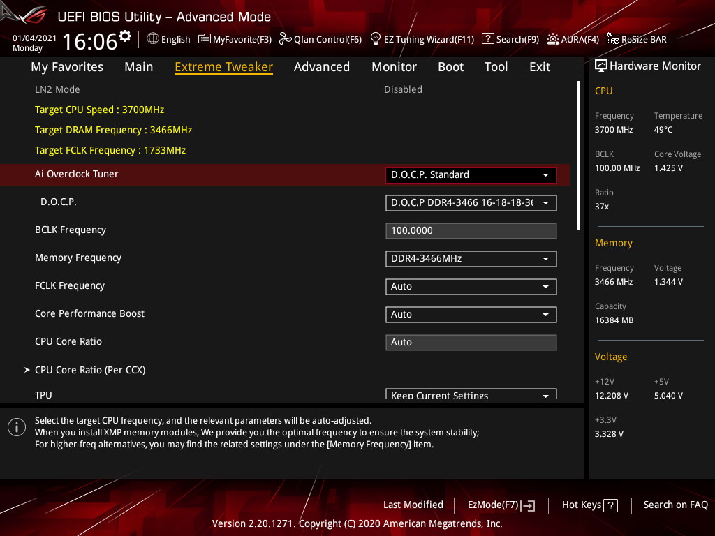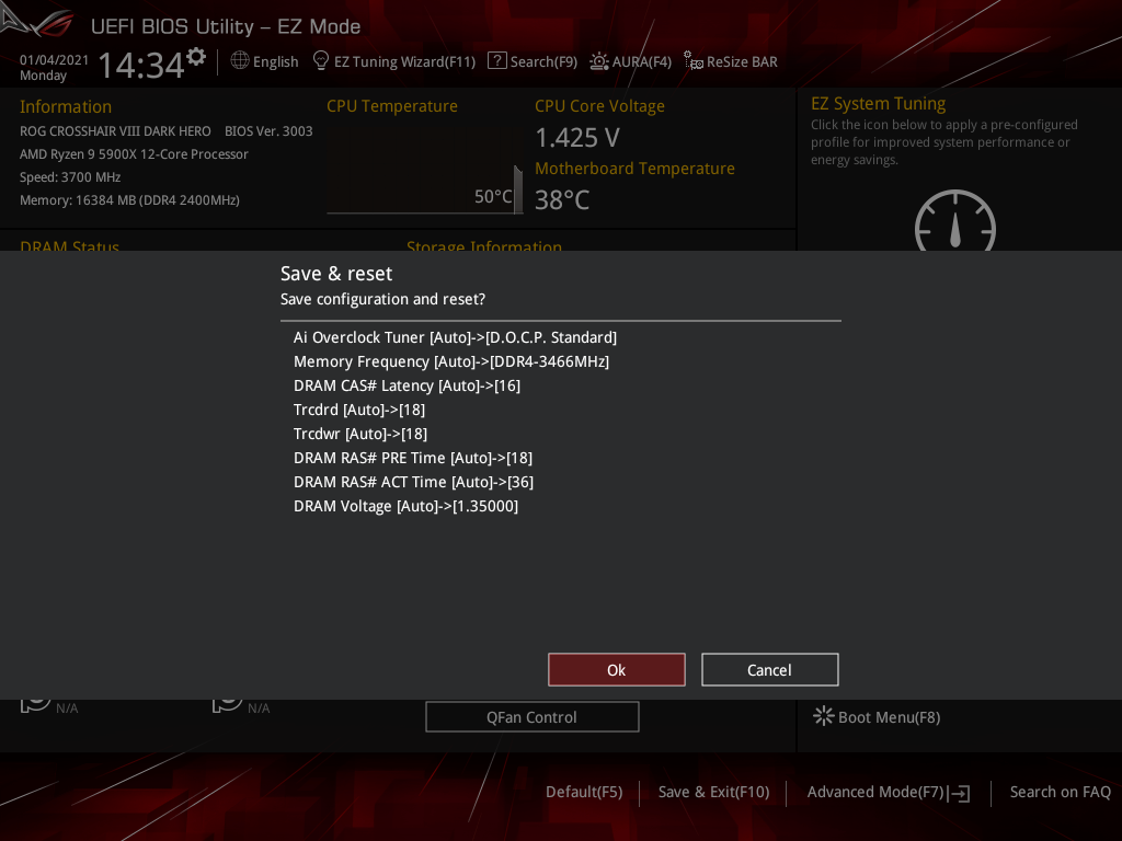 Активация XMP (D.O.C.P.): Memory Frequency — 3466 МГц, DRAM Voltage — 1,35 В, SOC Voltage — 1,08 В.