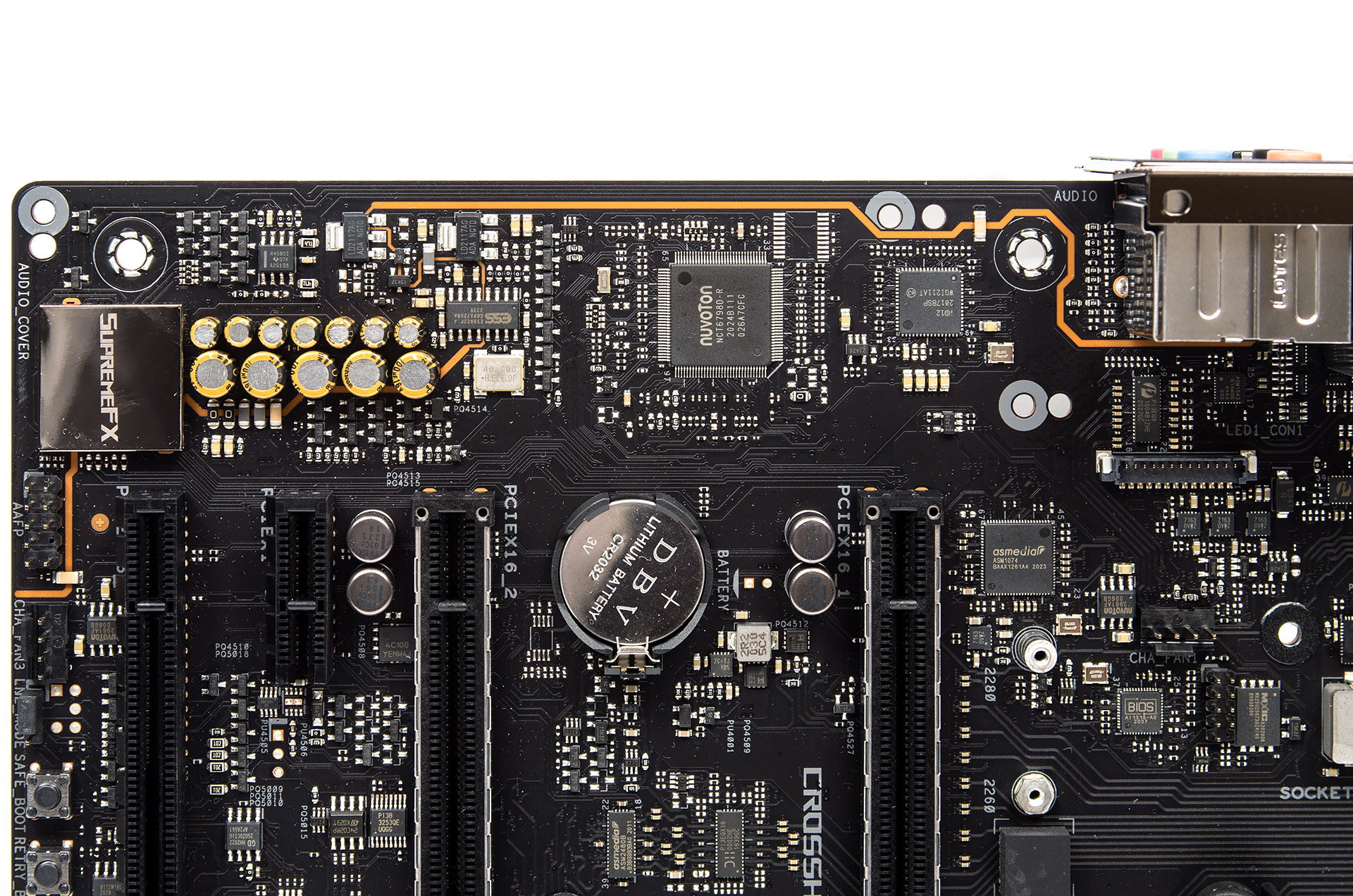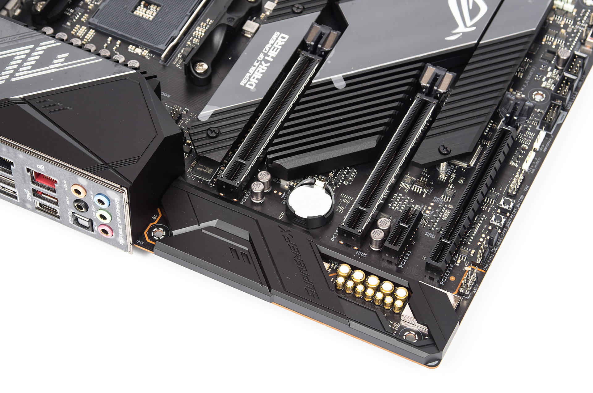 Использование четырёх пар повторителей сигналов плюс свитчей (модели — PI3EQX16000ZHE и ASM2480B) делает возможным функционирование двух армированных скоростных слотов PCI-E. Два более традиционных снизу связаны с X570.
