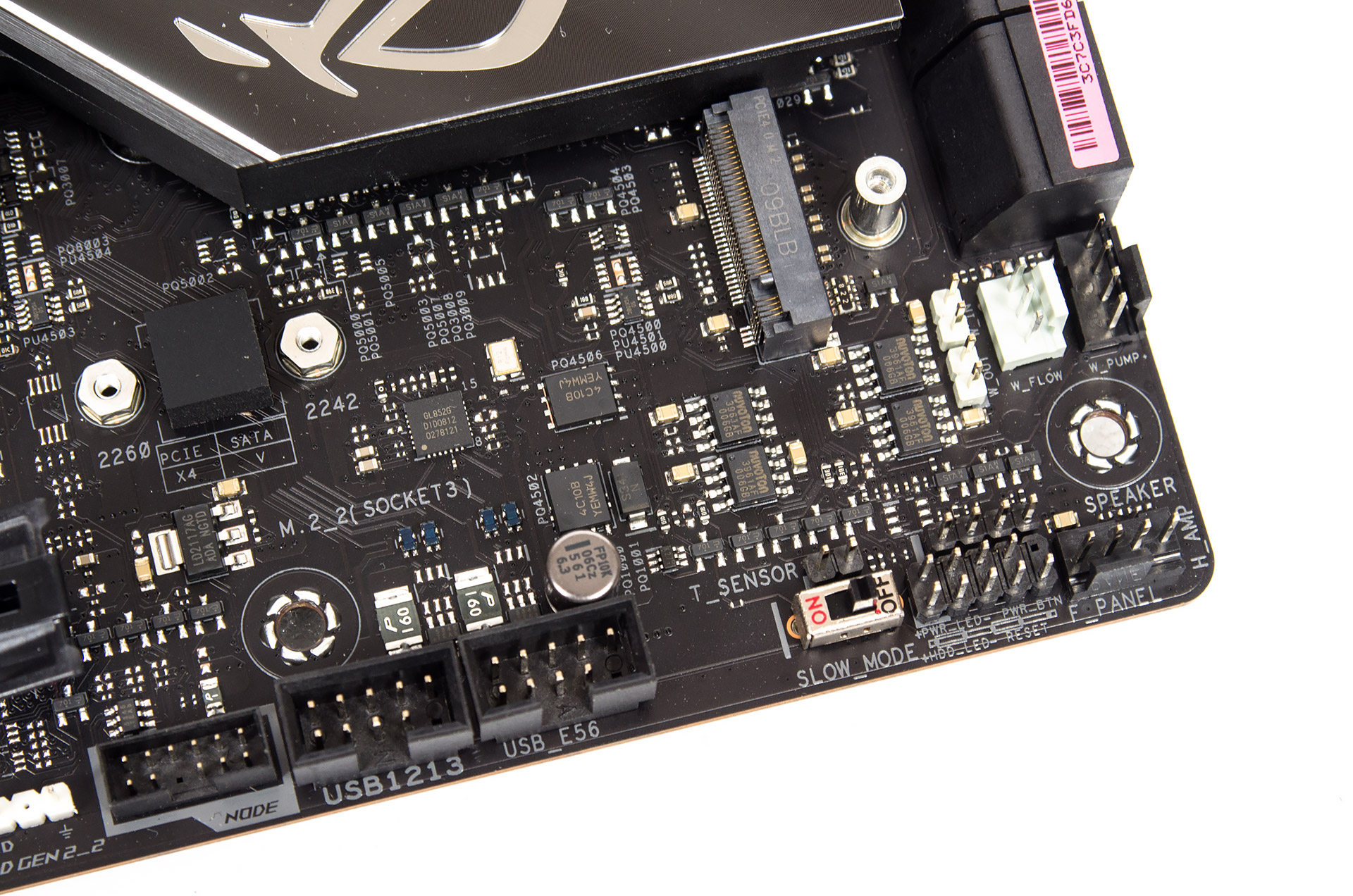 Площадки для подключения датчиков потока и температуры под самосборные СЖО предусмотрены у нижнего правого угла. Одну внешнюю термопару можно привлечь для организации алгоритмов замедления системных охладителей.