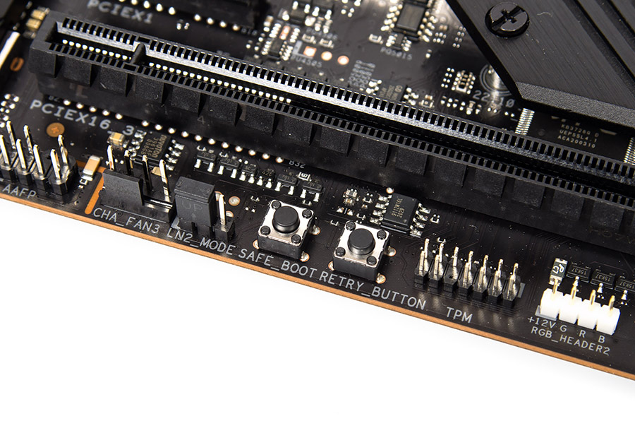 Ещё две полезные кнопки расположились у нижнего торца — Safe Boot и Retry, они пригодятся для разгонных экспериментов. Их функциональность можно назначить на традиционную корпусную кнопку сброса системы (Reset) посредством настроек UEFI.