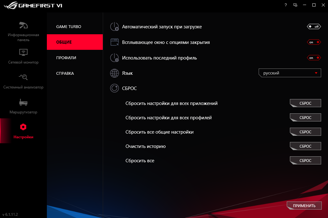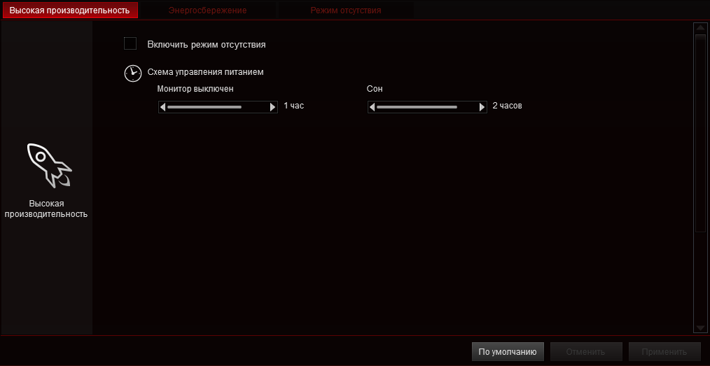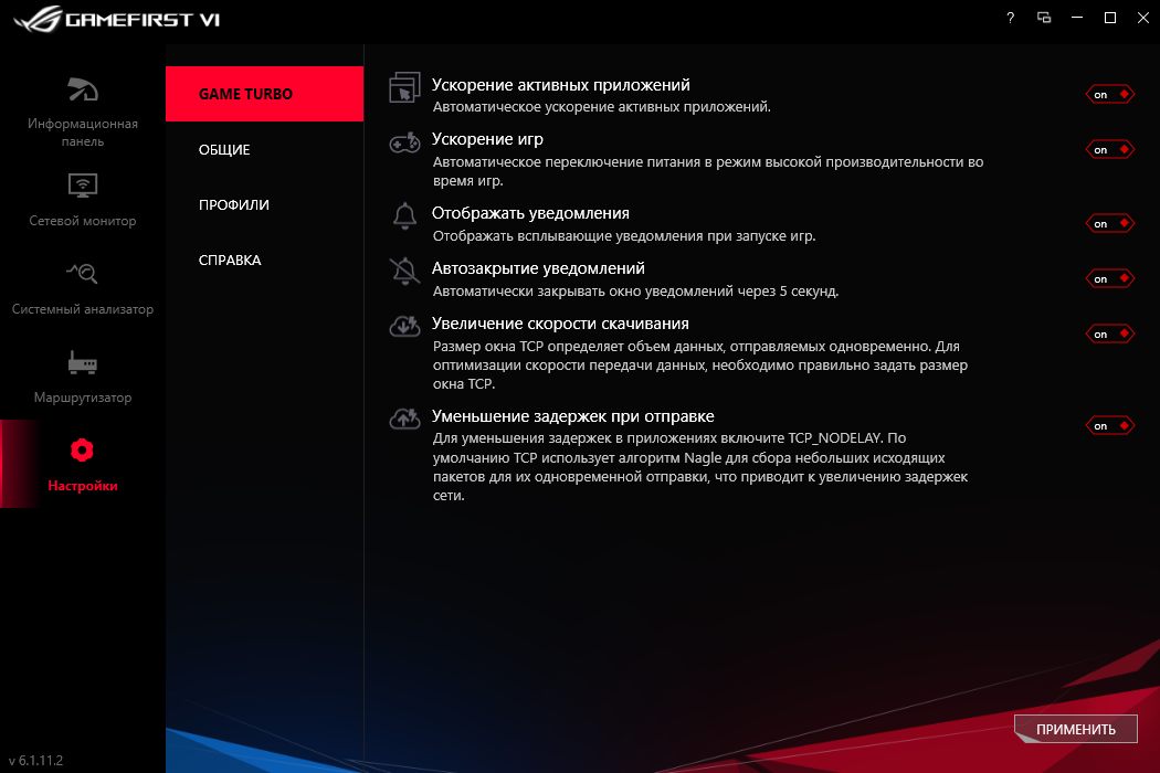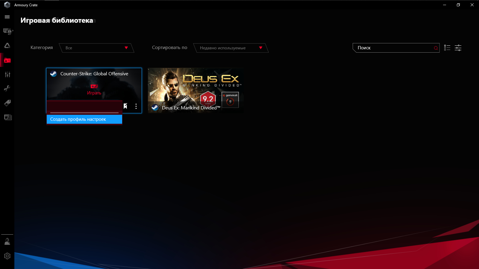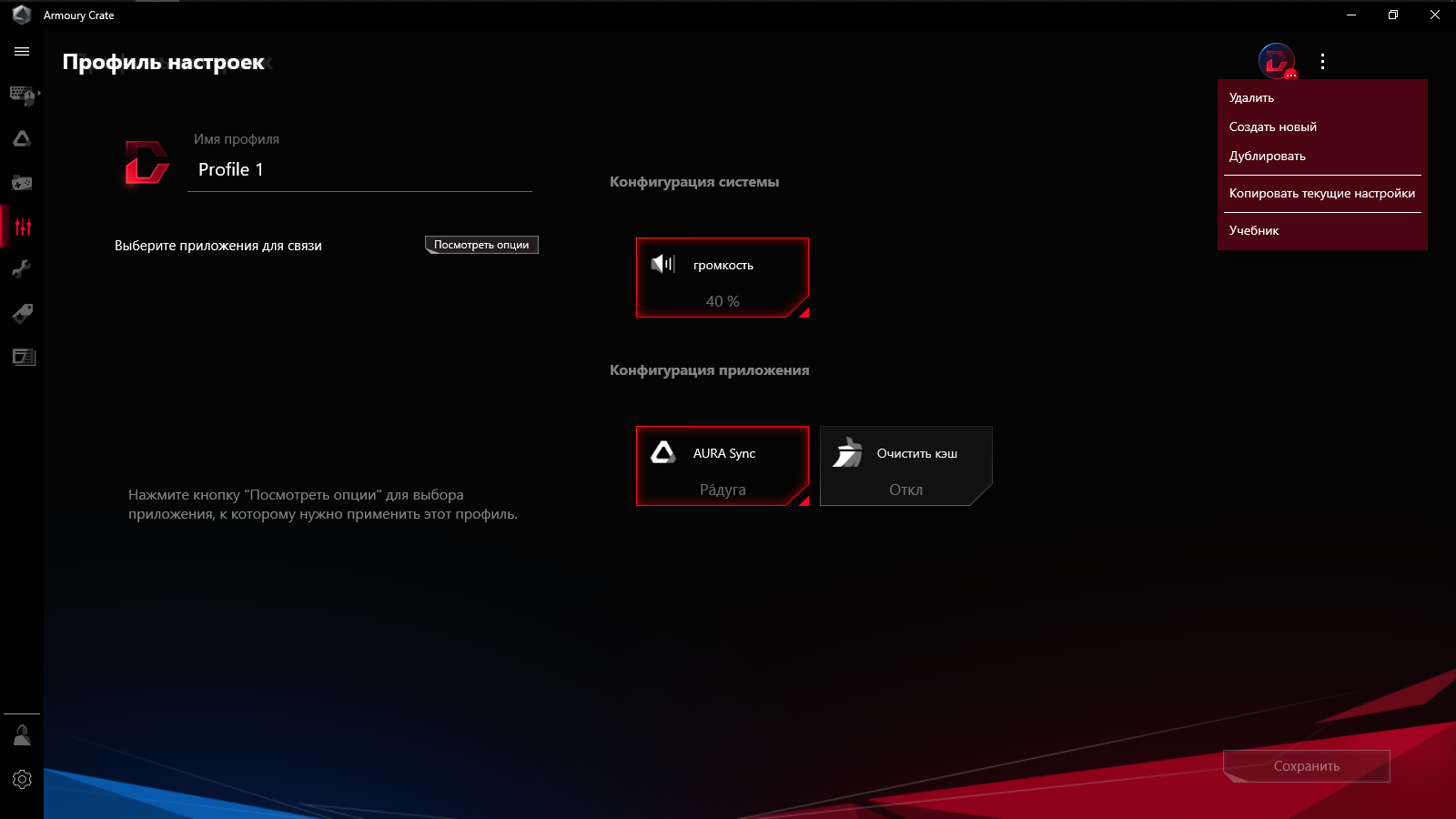 Предусмотрено создание профилей с настройками, которые можно привязать к запуску определённых игр и сопутствующему ПО, либо переключать их самостоятельно при необходимости.