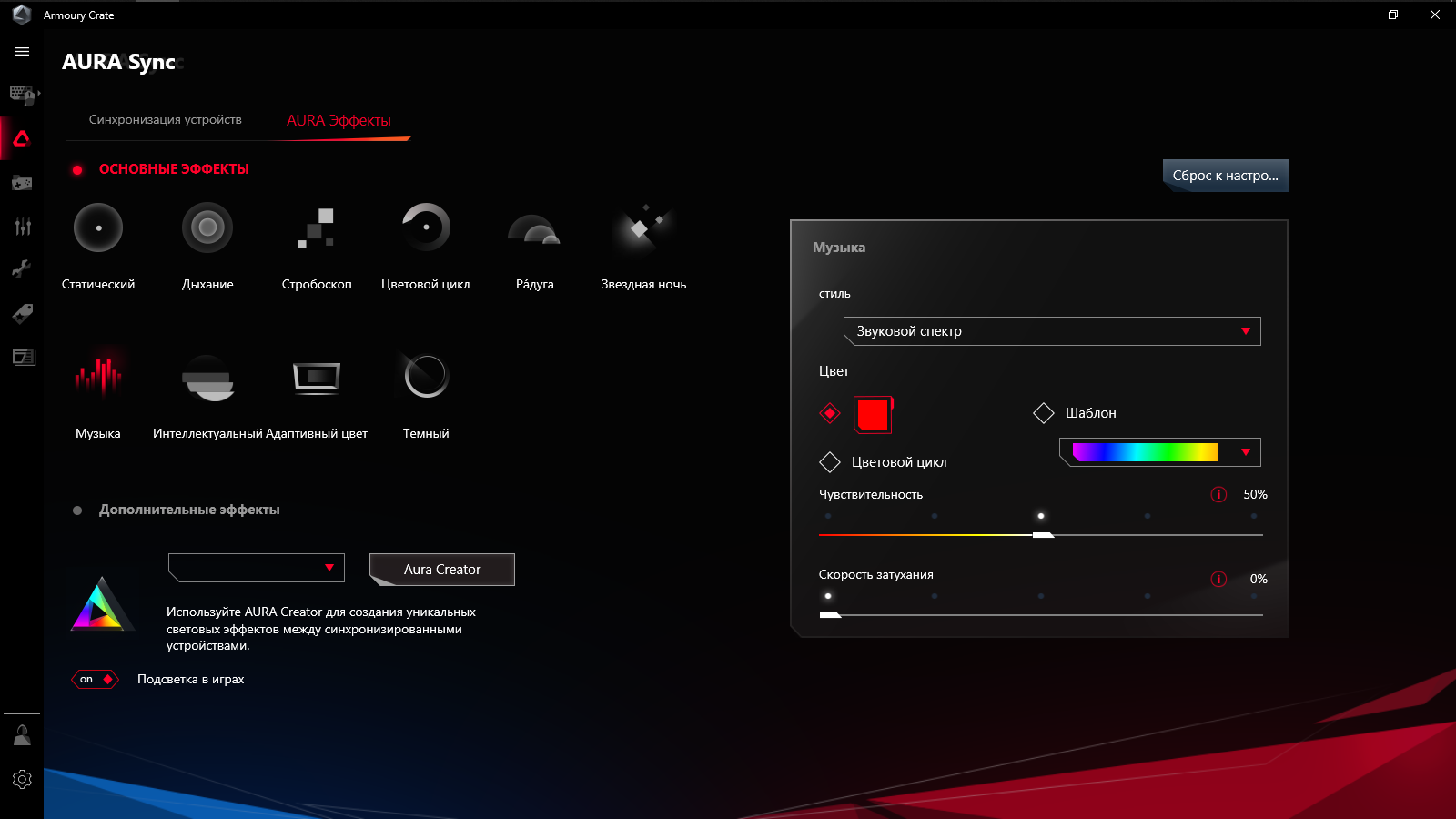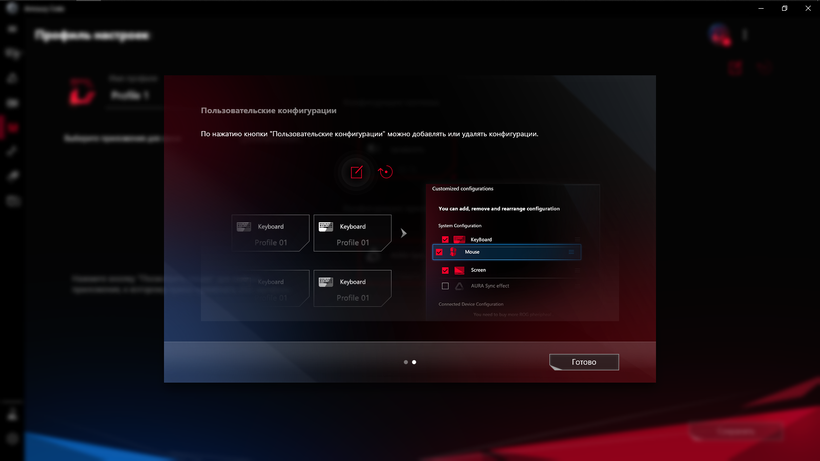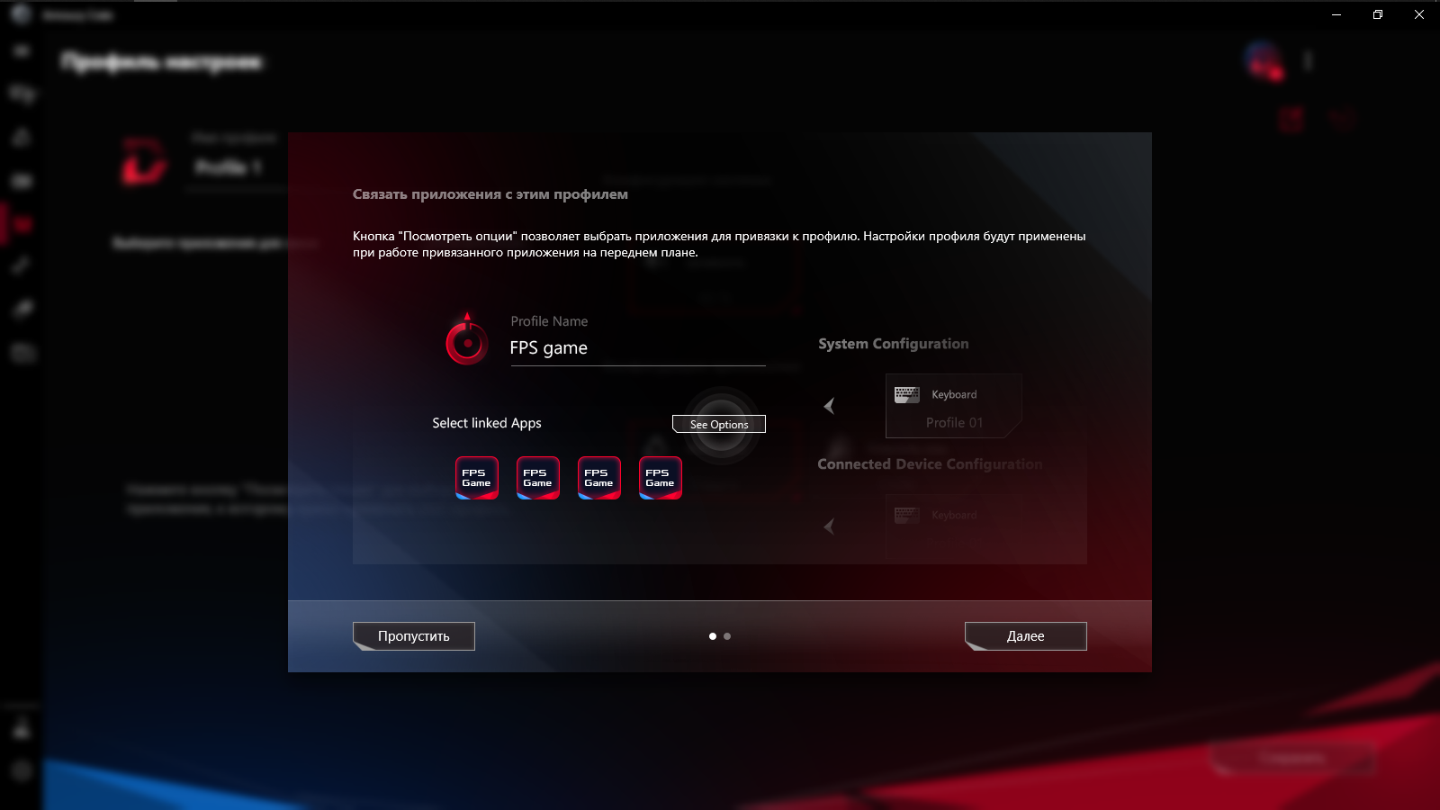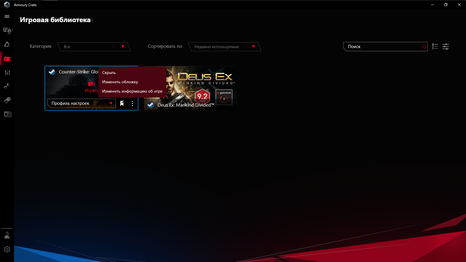 Предусмотрено создание профилей с настройками, которые можно привязать к запуску определённых игр и сопутствующему ПО, либо переключать их самостоятельно при необходимости.