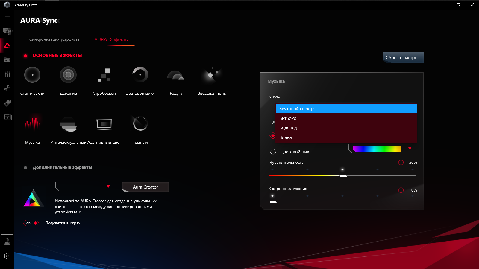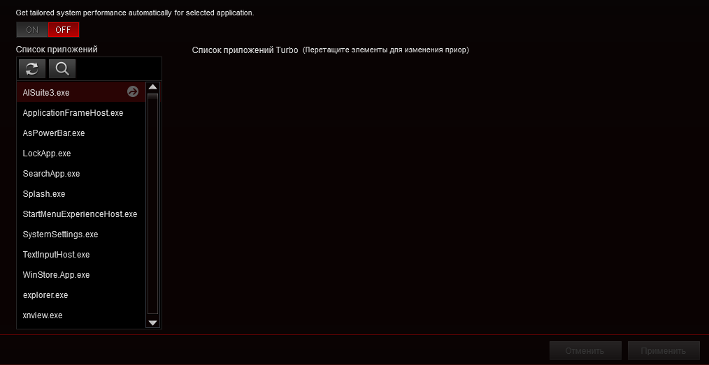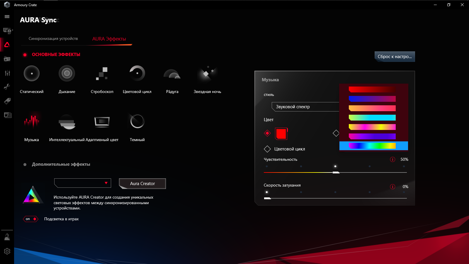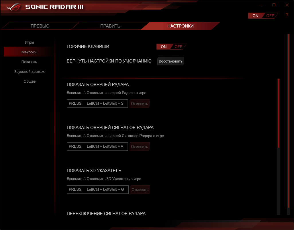Предусмотрено создание профилей с настройками, которые можно привязать к запуску определённых игр и сопутствующему ПО, либо переключать их самостоятельно при необходимости.