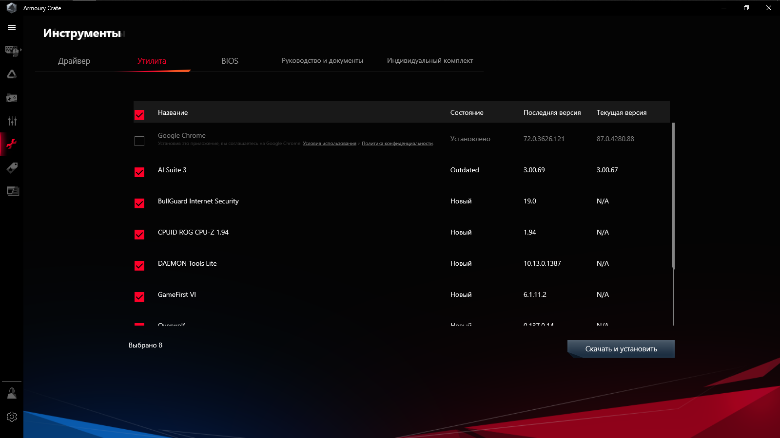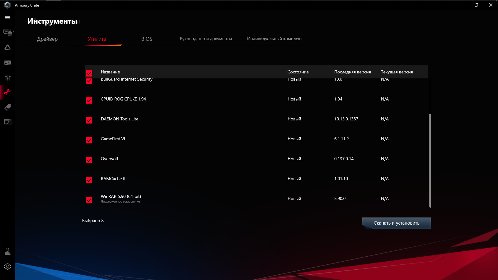 Программное сопровождение достаточно обширно. GameFirst прибавил единицу к номеру версии, в списке теперь нет RAMDisk, зато есть DTS Sound Unbound. Как и прежде, из среды Armoury Crate доступен к установке антивирусный комплекс BullGuard IS.