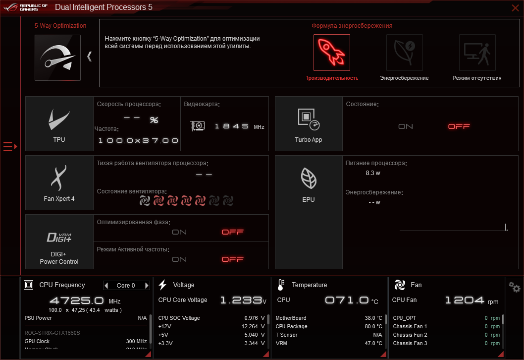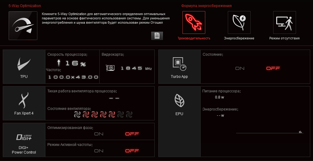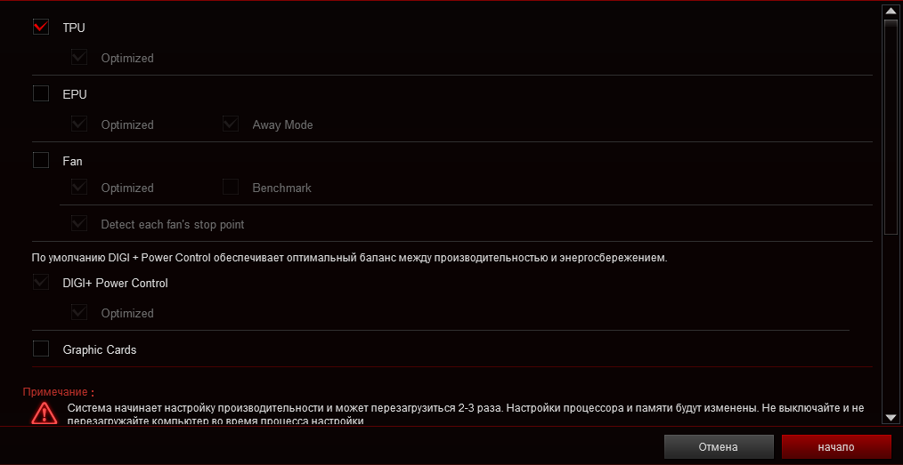 На месте осталась пара фирменных сценариев TPU, ускоряющих систему, как и блок профилей Performance Bias.