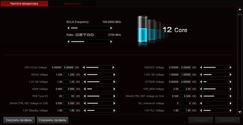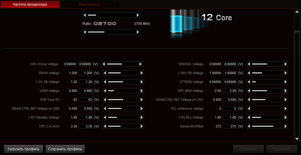 | CPU Core Voltage Offset (В) | (+/–) 0,00625…0,45 | 0,00625 |