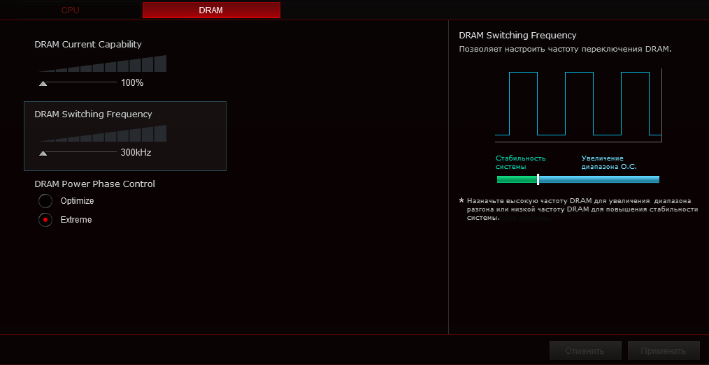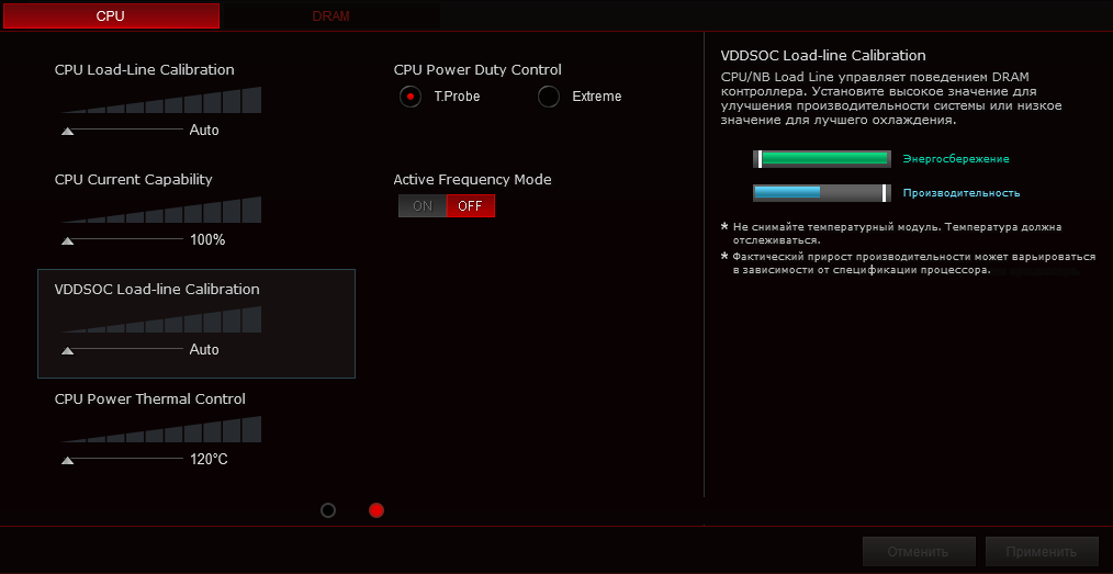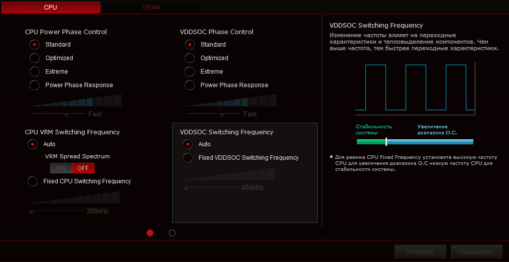 Для наладки работы подсистемы питания имеется большое число пунктов, включая набор профилей LLC, ещё можно модифицировать частоту ШИМ на разных узлах.