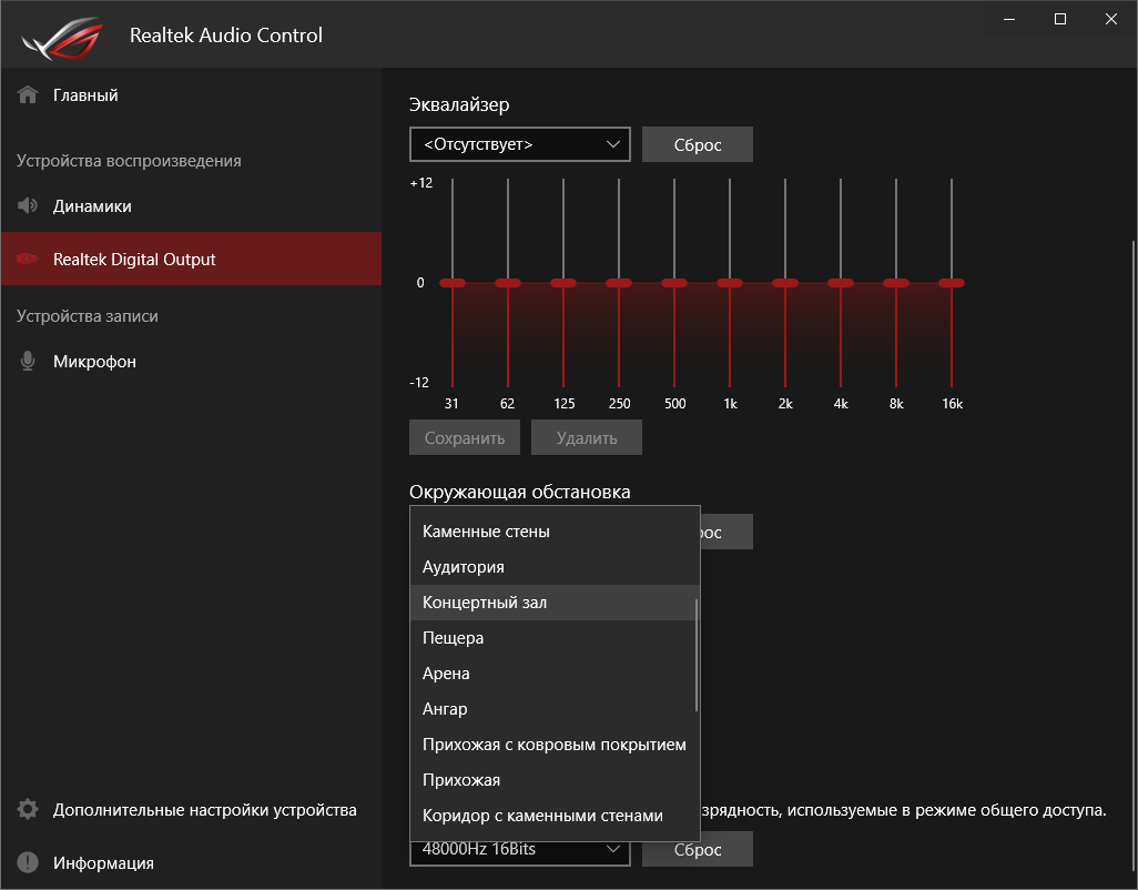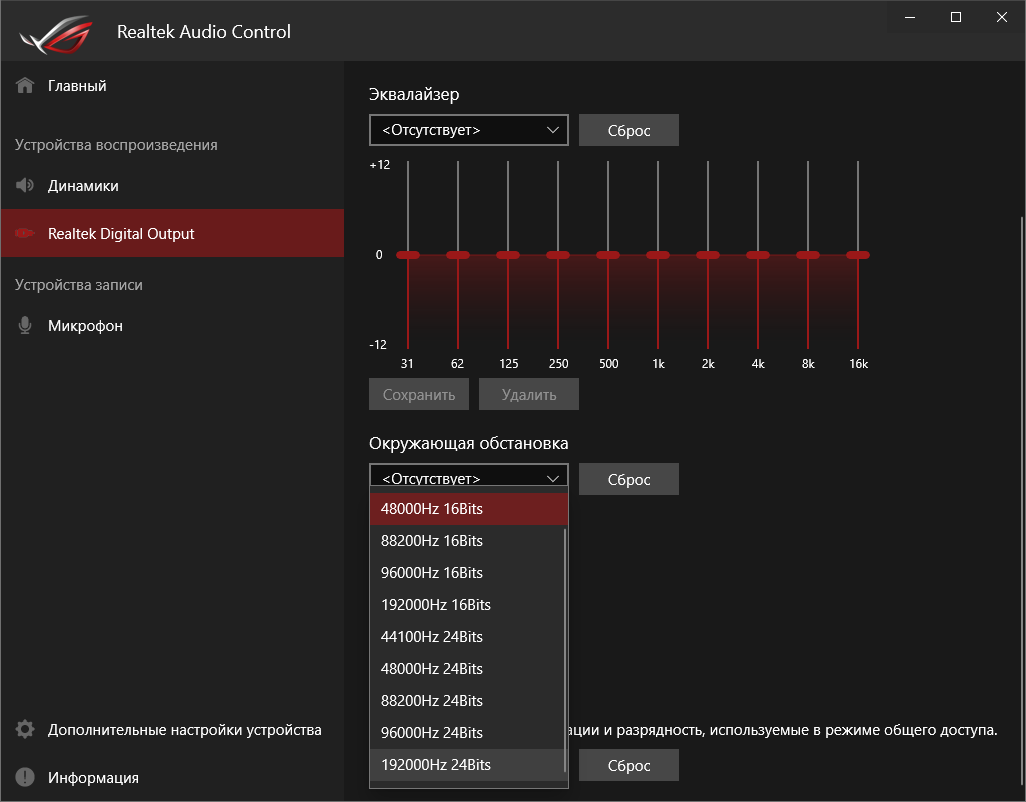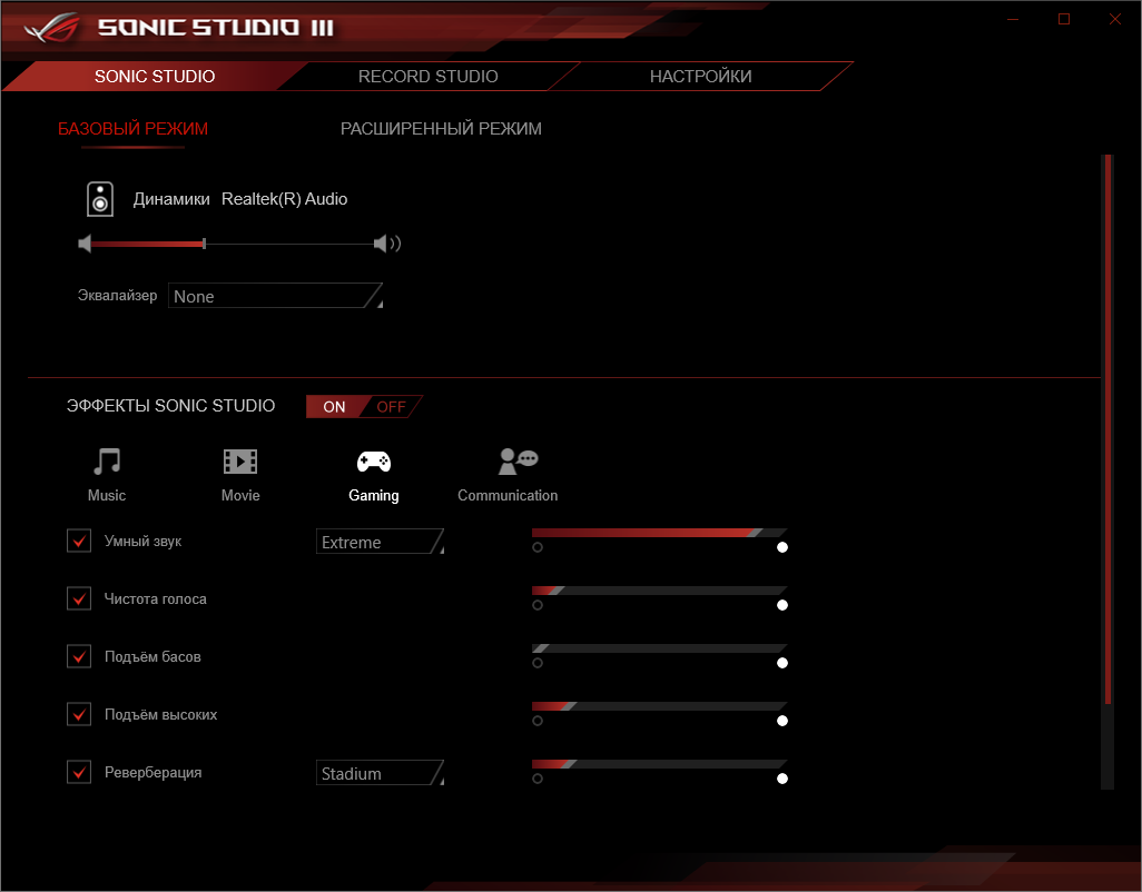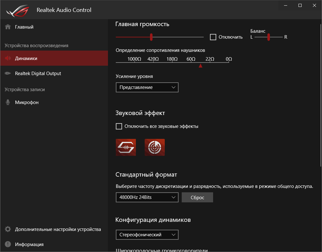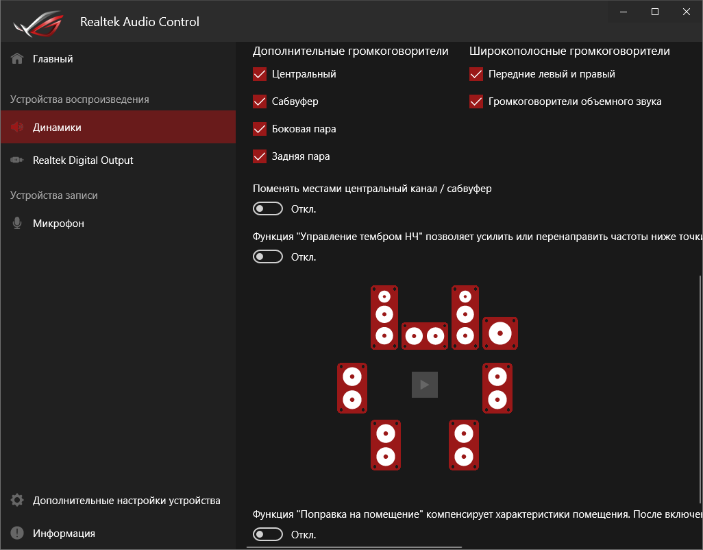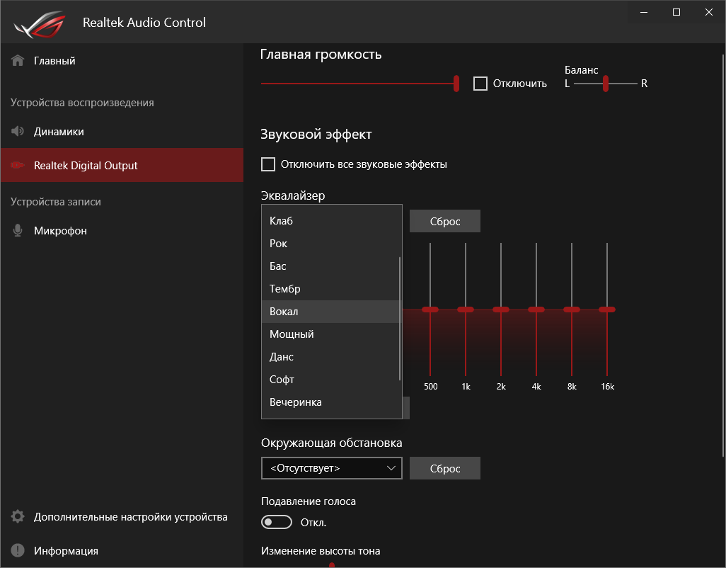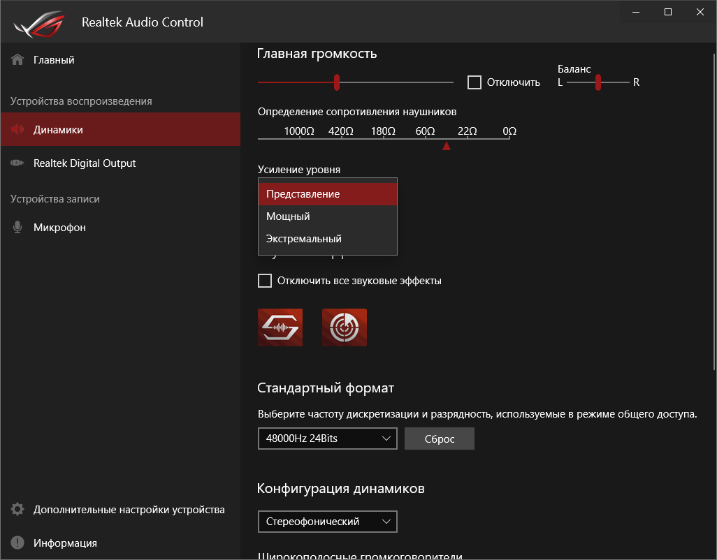Базовая наладка звучания проходит при участии фирменной среды от Realtek. Выделить можно профили для предусиления выходного сигнала, которые действительно работают.