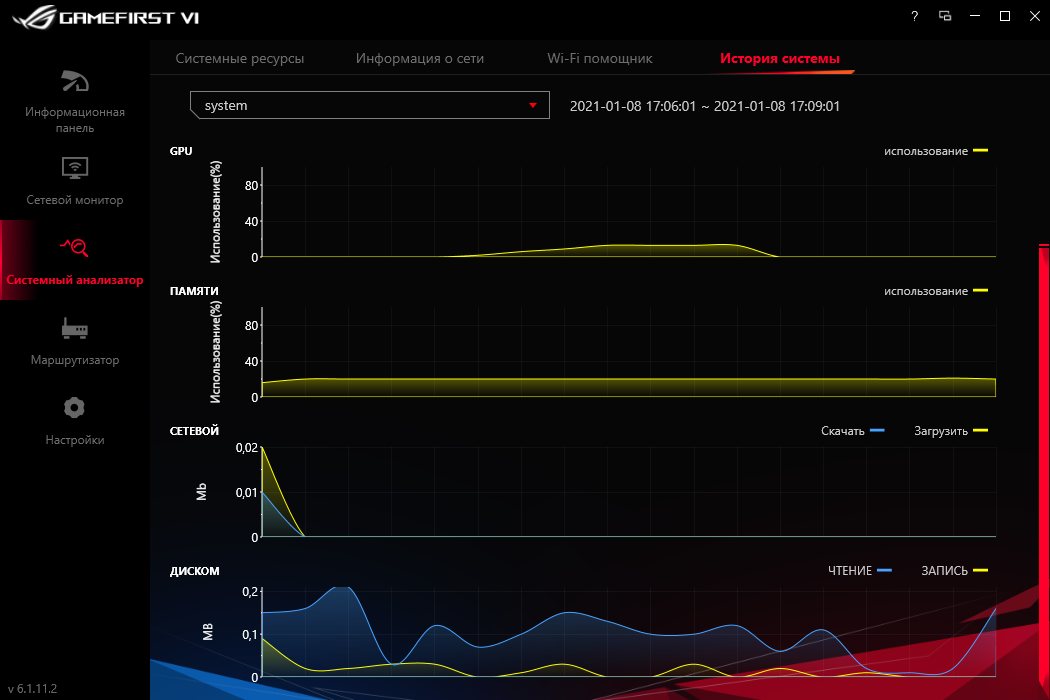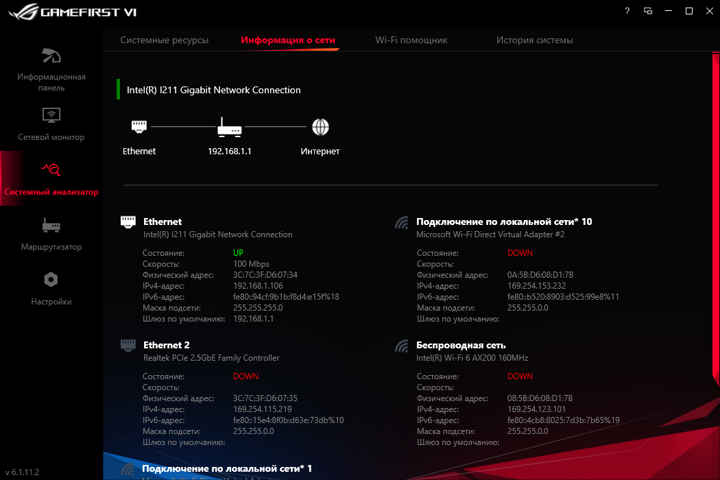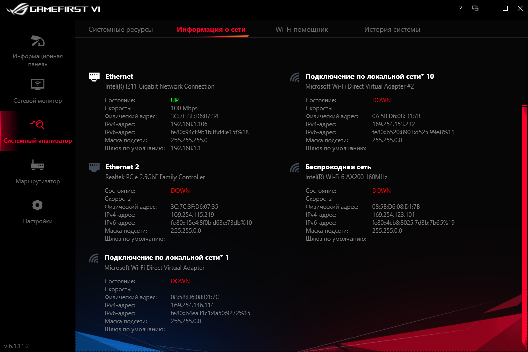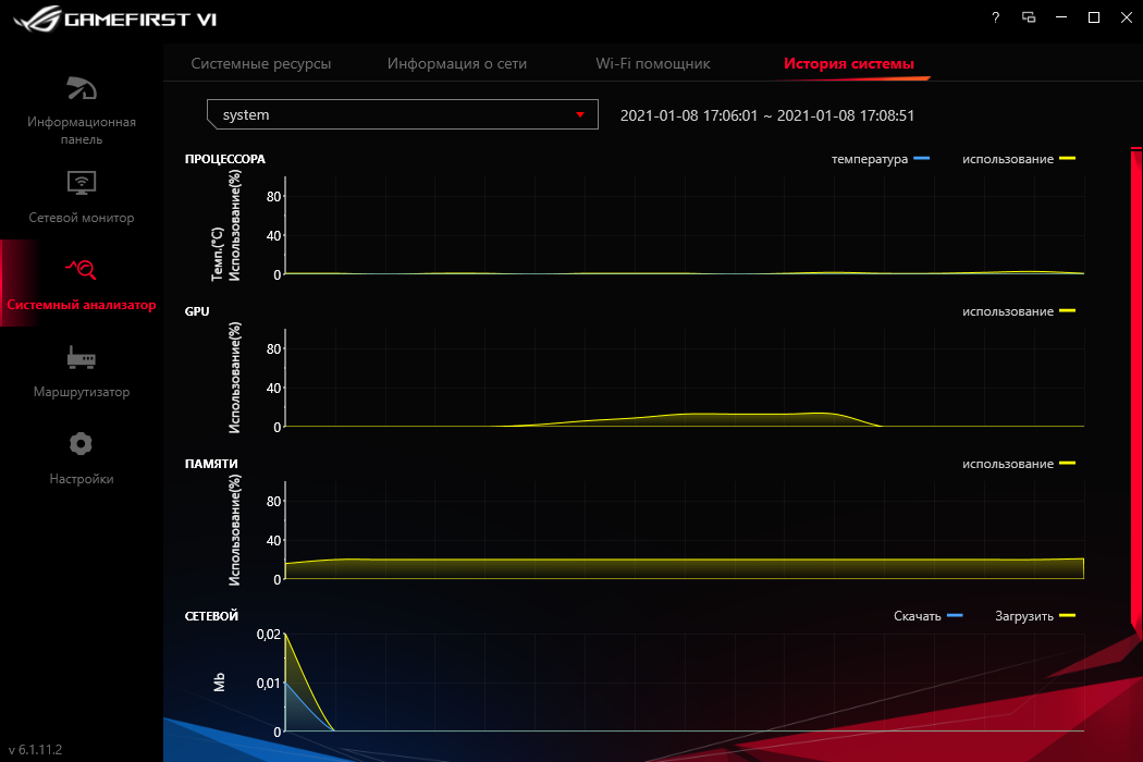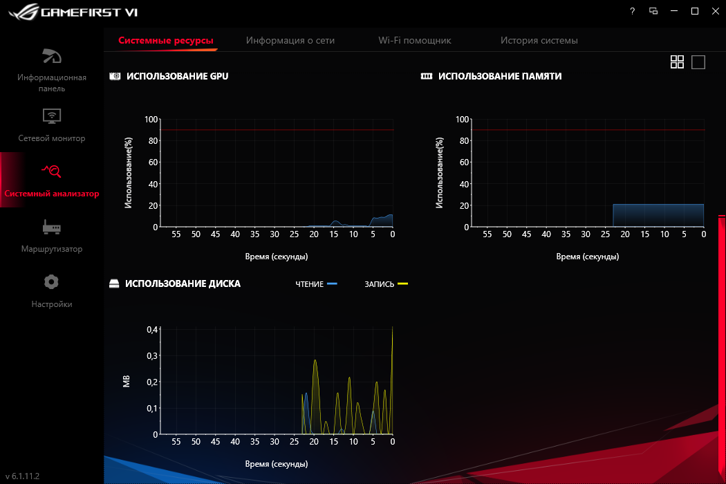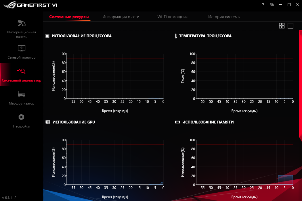 GameFirst VI не только выстраивает приоритет для программ при их доступе к Сети, теперь ещё есть модули для наблюдения за системными параметрами в режиме реального времени. В рассмотренной сборке не работало отображение температуры процессора, вероятно, она появится в более новых. В остальном замечаний нет, все сетевые интерфейсы здесь контролируемы.