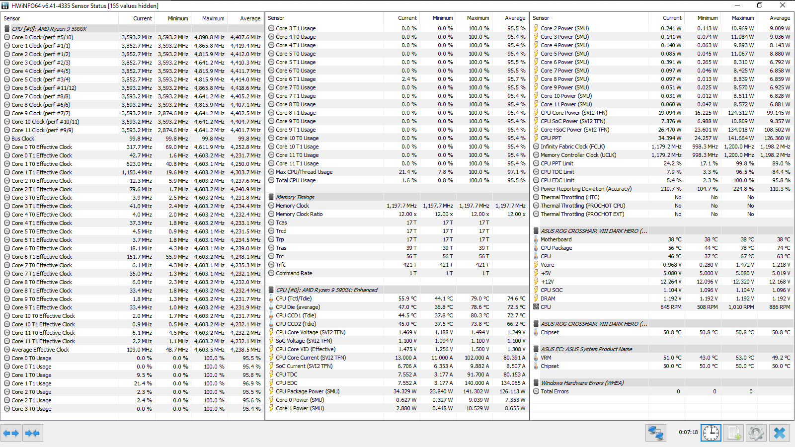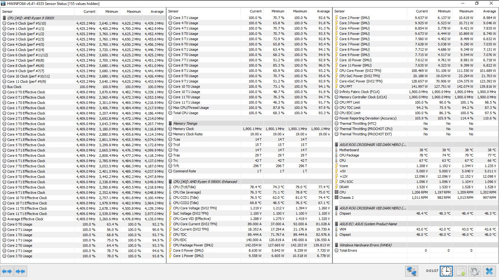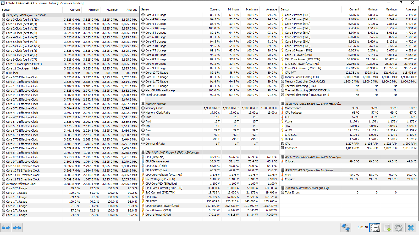 Разгон ОЗУ: Memory Frequency — 3800 МГц, FCLK Frequency — 1900 МГц, DRAM Voltage — 1,53 В, SOC Voltage — 1,1 В, SOС LLC — Level 5, CPU Fan — максимальные обороты.