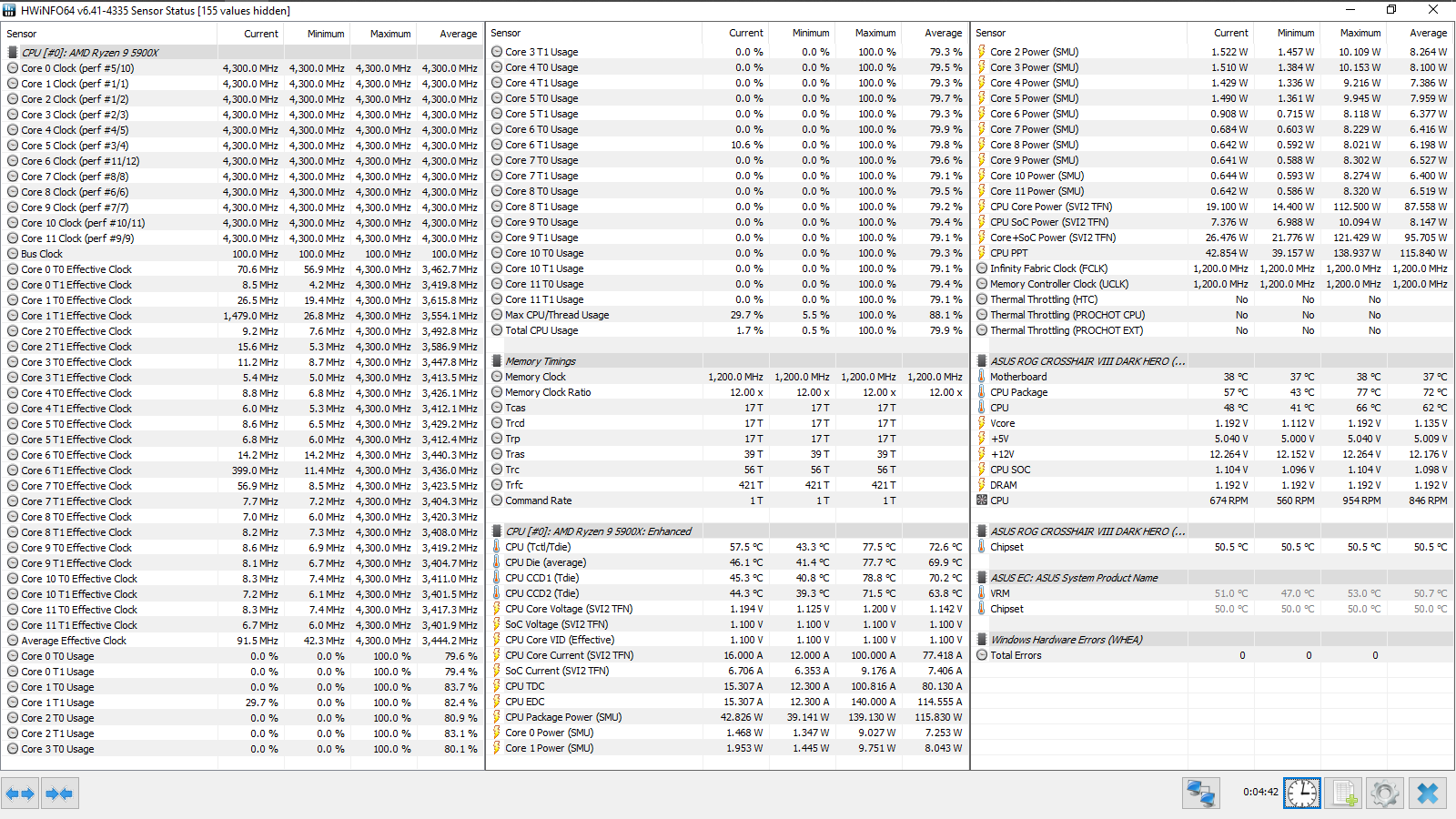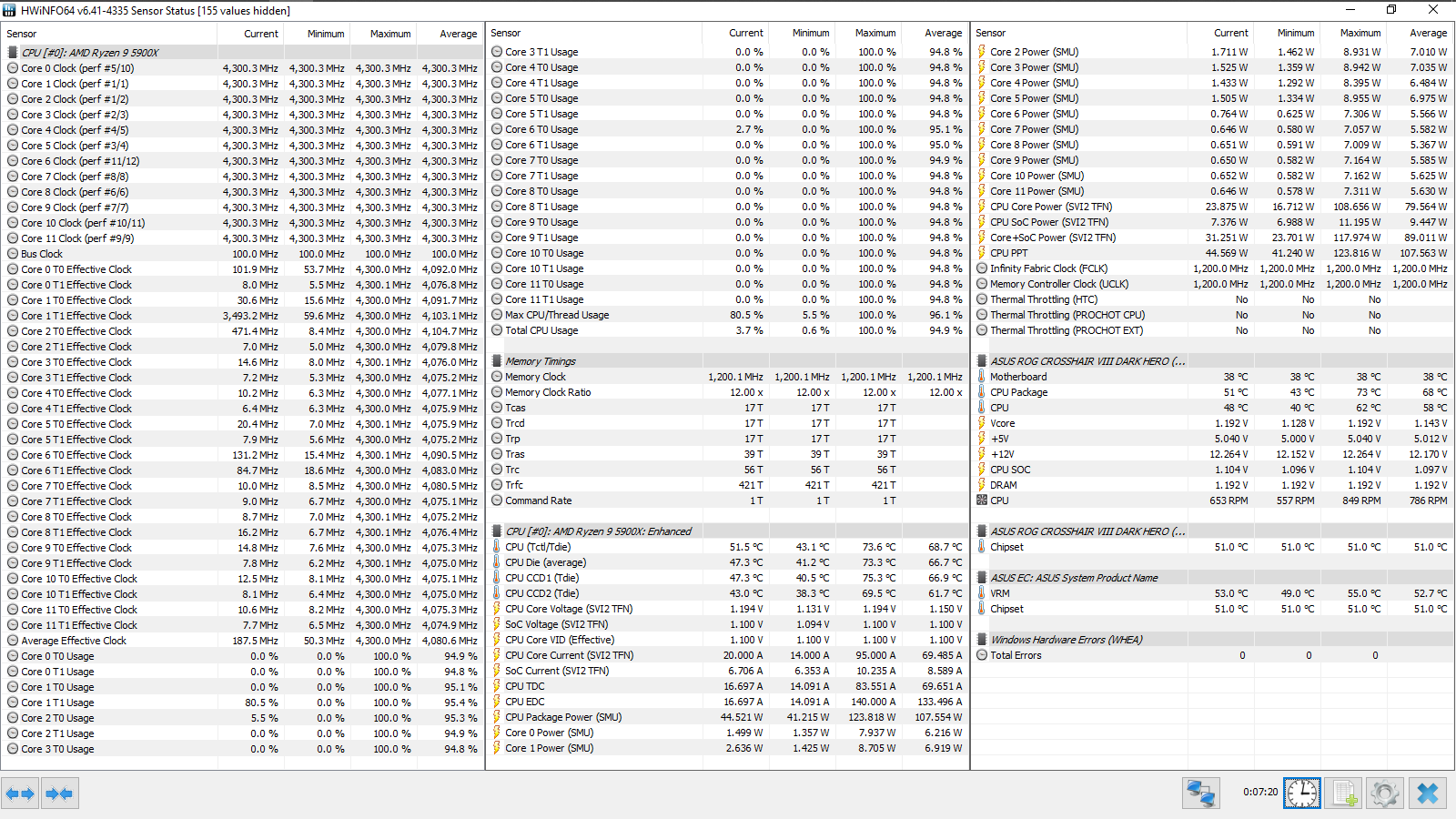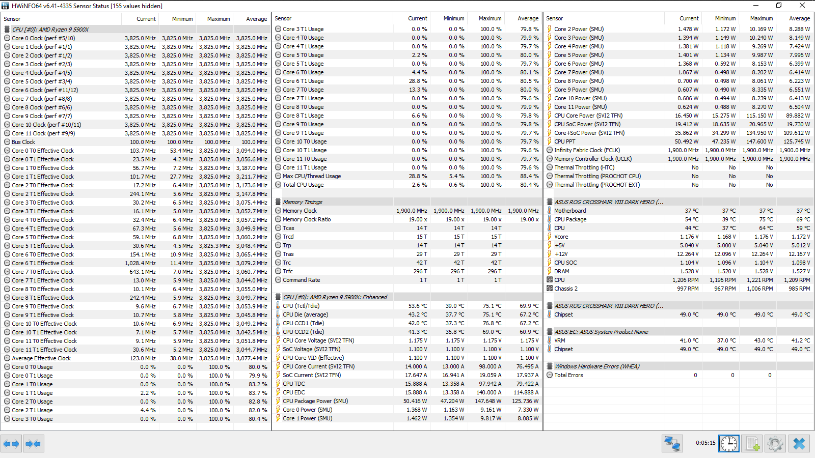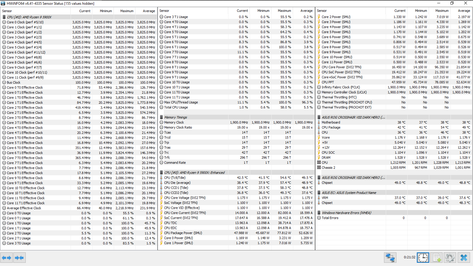 Разгон ОЗУ: Memory Frequency — 3800 МГц, FCLK Frequency — 1900 МГц, DRAM Voltage — 1,53 В, SOC Voltage — 1,1 В, SOС LLC — Level 5, CPU Fan — максимальные обороты.