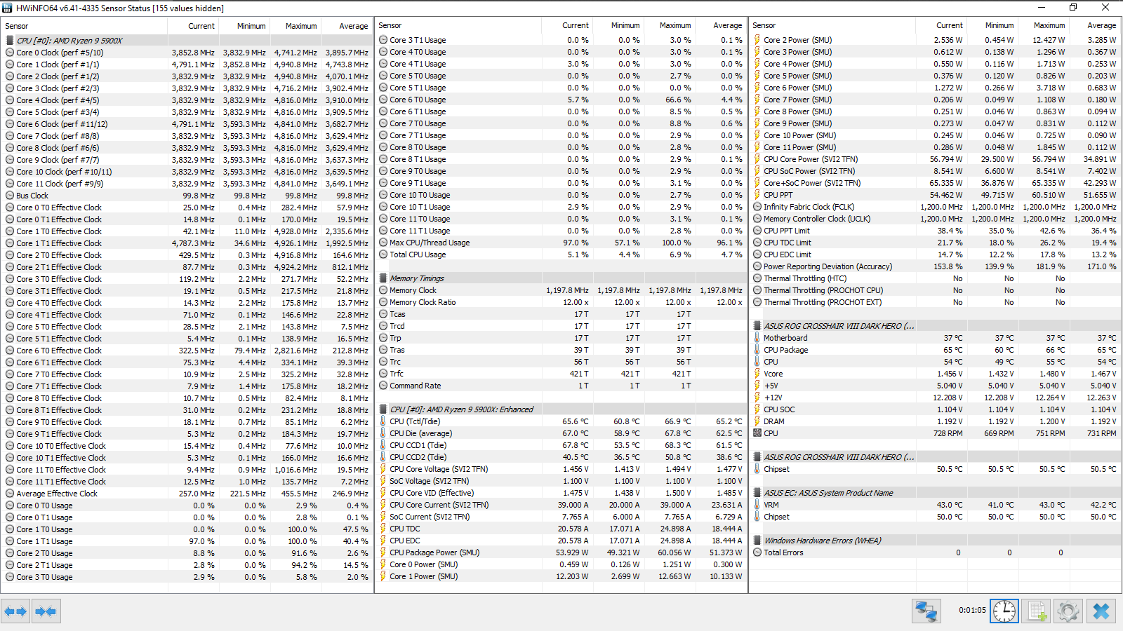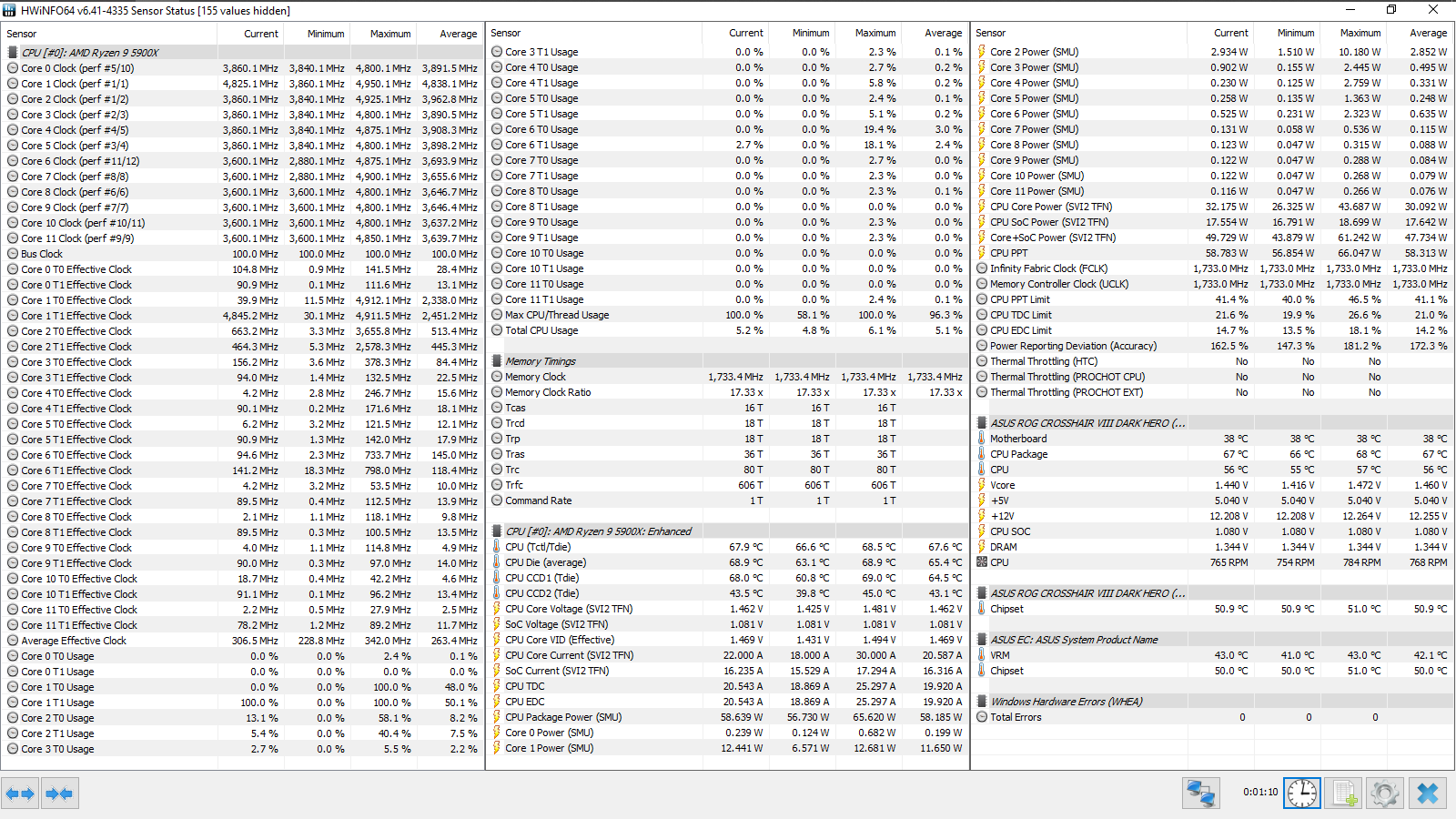 Cinebench R23 CPU (Single Core) — 1605 pts. CPU Core Voltage (avg) — 1,455 В. CPU Package (avg/max) — 68/70 °C.
